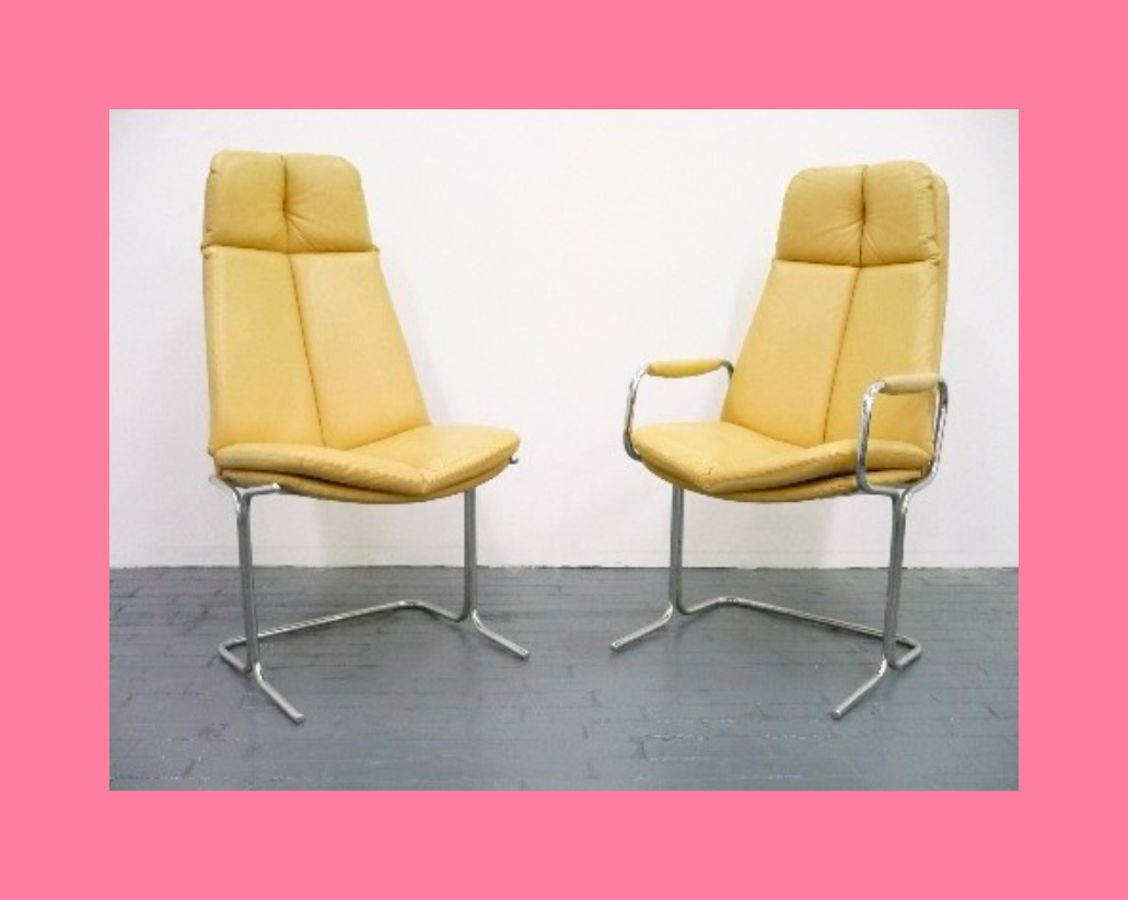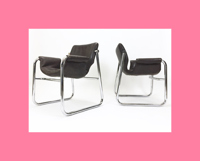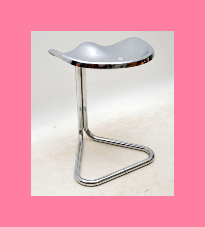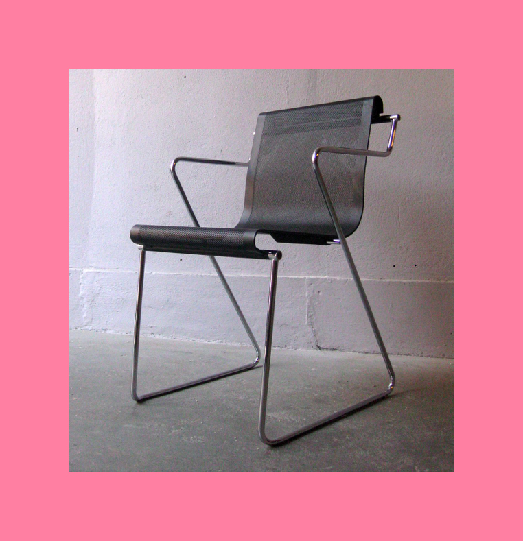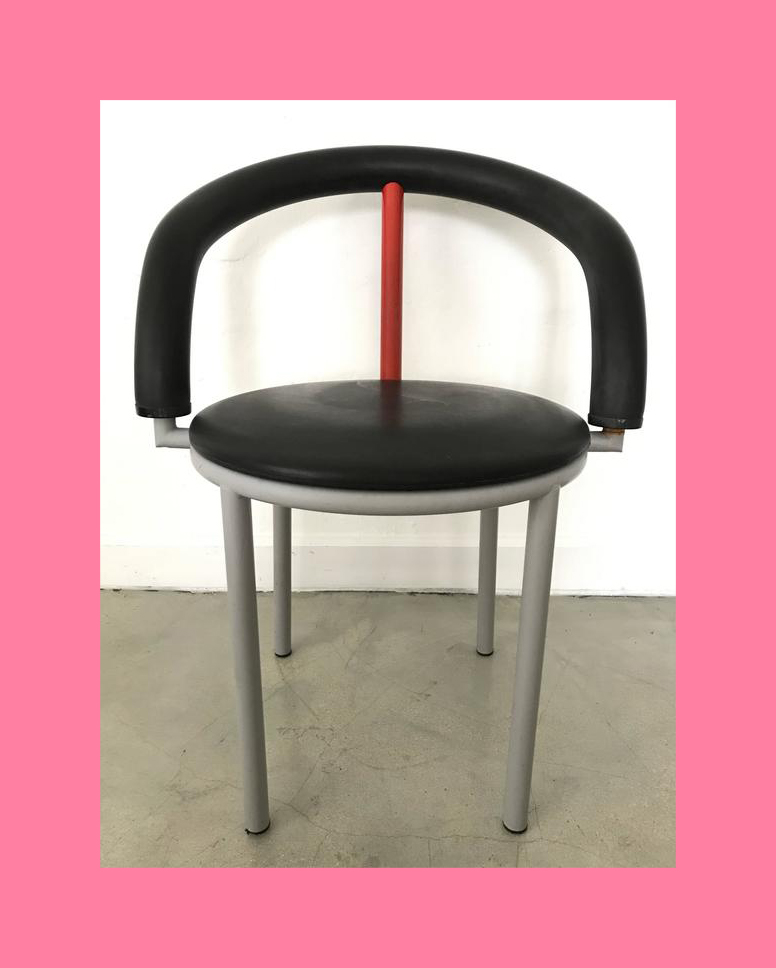 These Postmodern chairs are interesting. They are a grey steel frame design with black rubber seat back and cushion. They date from 1985 and were designed by Anna Anselmi for Bieffeplast, Shout out to Mike Schatzman for the info!