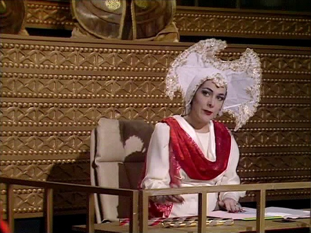 Meanwhile, on outside broadcast video, a ‘Carry On’ star sits on a mock up of a curule seat, used from Roman emperors to Napoleon. It’s a chair that could stand up to a pudding eating competition to the death.