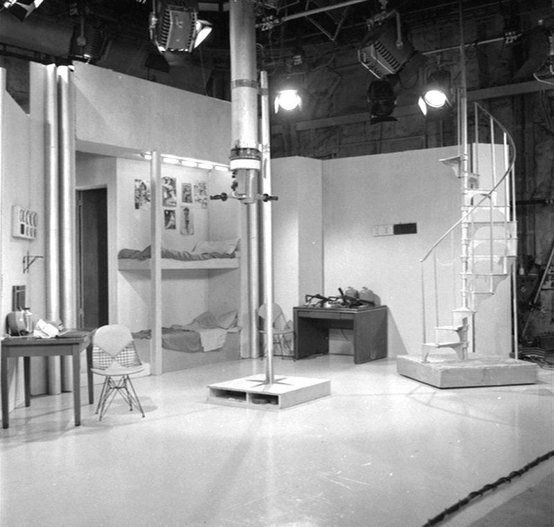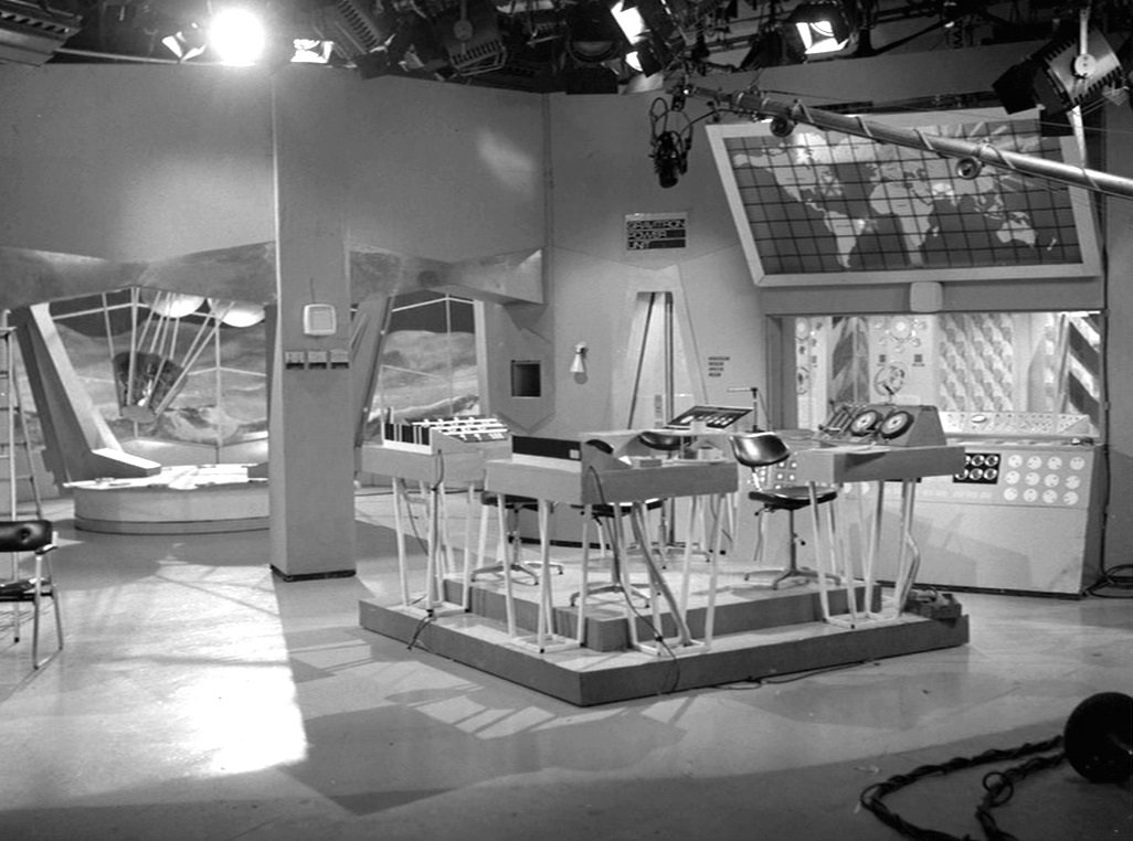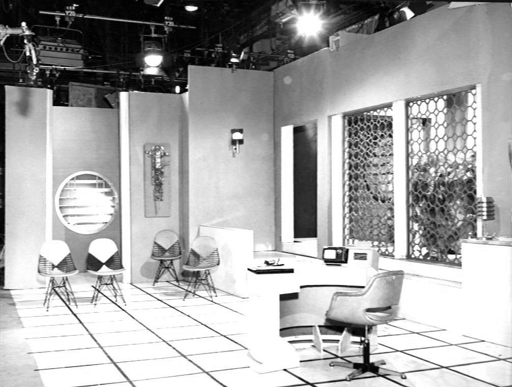 The chairs seen around the table in the production photos are different to the chairs that appear in the final transmitted version. Perhaps there was a sudden need to accommodate additional guests on an argumentative edition of Late Night Line Up, or something like that.