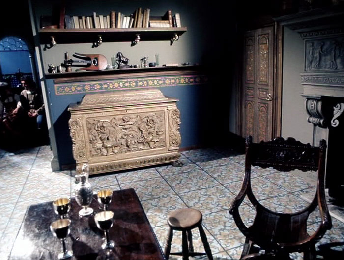 Looking at the era overall, the most impressive use of chairs is when there is a historical context to them – from Renaissance Italian armchairs, to the grand statements found in the study of Harrison Chase. The use of space age furniture is a little more slap dash – that would find its natural expression the following season. Therefore it’s not full marks, but as Borusa judged at the end of ‘The Deadly Assassin’ – “Nine out of Ten“.