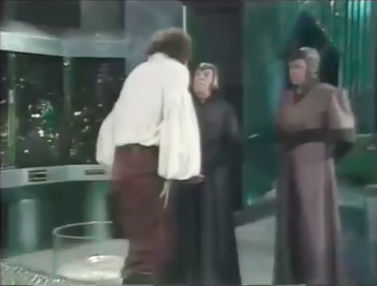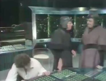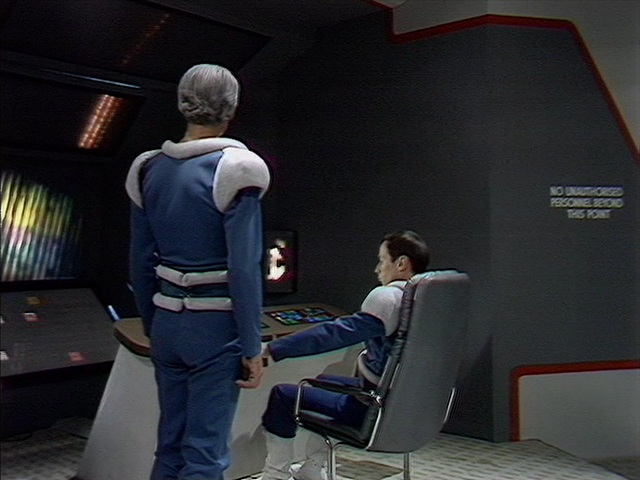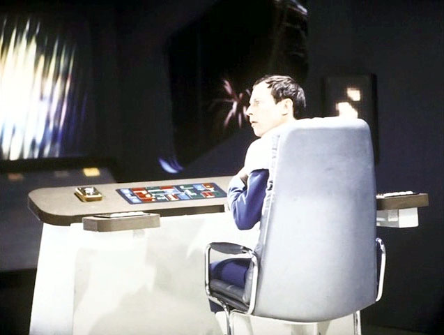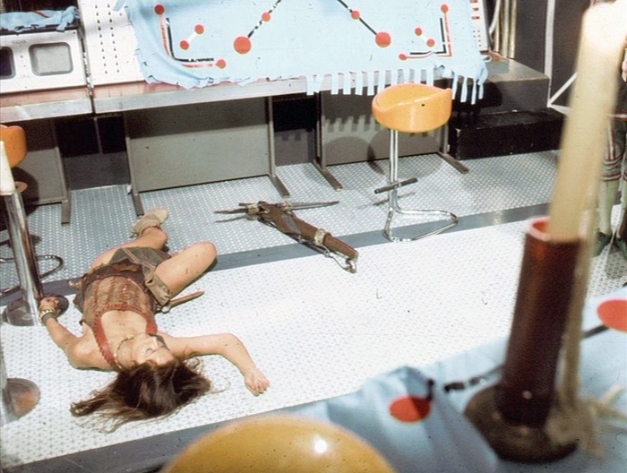 Back on the Morestrian ship, there are further Kinsman stools, and a chair that I recognise from Blake’s 7 – Project Avalon. I think it’s a custom prop, possibly inspired by this Charles Hollis Jones Lucite Chair from the 1960’s. Maybe its origins can be traced to Pinewood Studios, where it featured in ‘Live and Let Die’ (1973) with Solitaire predicting various futures.
