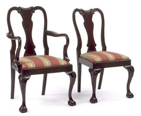 Dining chairs that echo the work of Thomas Chippendale. It’s Chinoiserie style in design, and might be a ‘pagoda’ chair. By the time of Ripper era London, the vogue for Chinoiserie style was on the decline, but it serves ‘Talons’ beautifully.