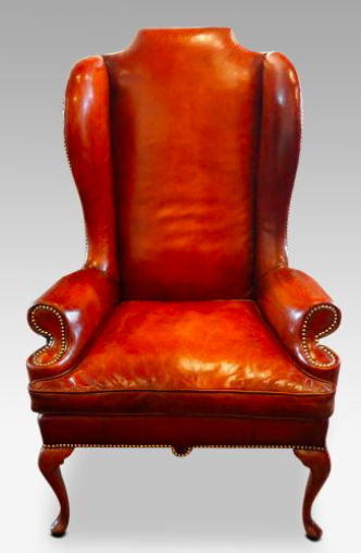 Opposite the Chesterfield is a Queen Anne style leather wing armchair, similar to this one, but not quite enough to give it the pink border.