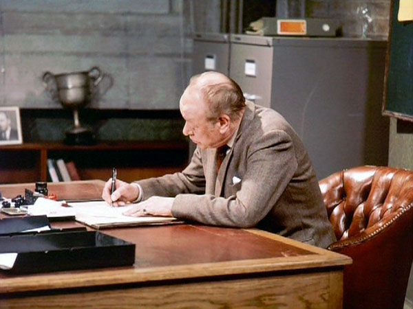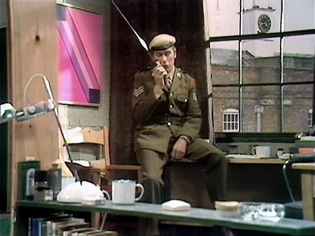 At UNIT HQ we have a repeat appearance of one of the first ever chairs seen in Doctor Who. This is a cast aluminium and plywood school chair manufactured by Esavian, originally designed by James Leonard in 1948.