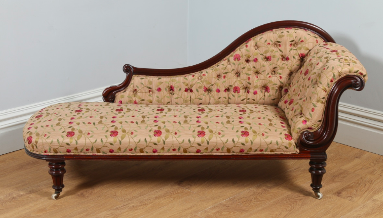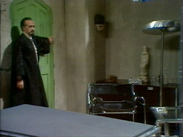 We open in the Doctor’s lab, with an antique Victorian Mahogany upholstered Chaise Lounge.
