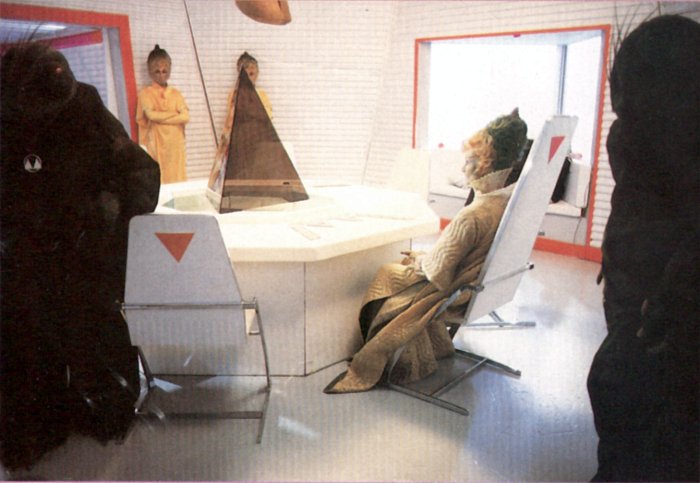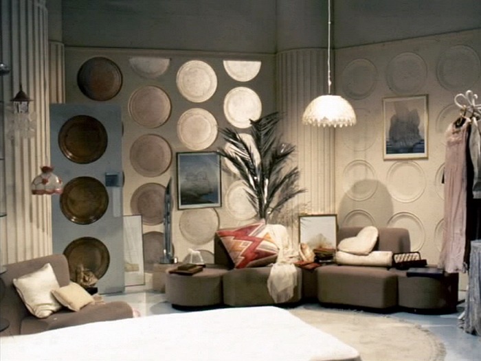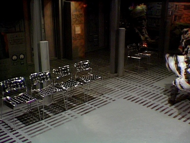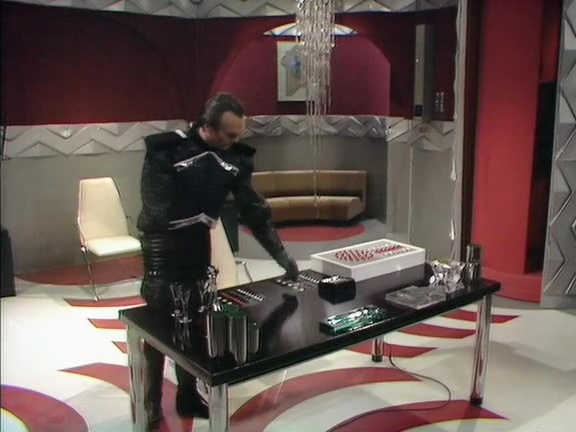 Either way, the Z-framed cantilever chairs, suggest the world of Pierre Cardin, Milo Baughman, or chairs by ‘Flair’. These chrome designs, of various heights, will appear a few times over the next few years, and also pop up in Blake’s 7 on the planet Helotrix, recorded not long after ‘The Leisure Hive’.