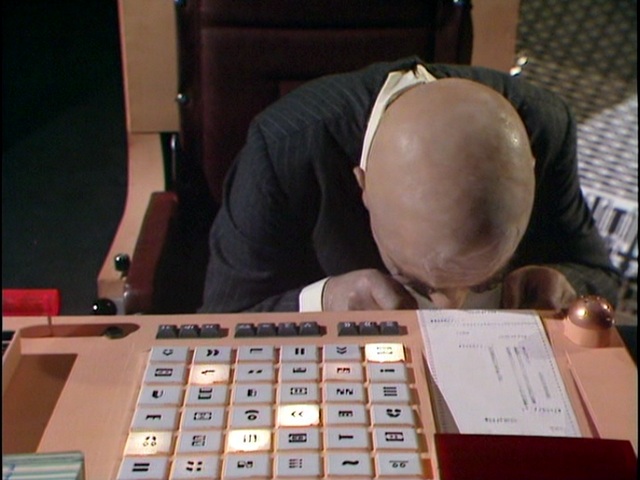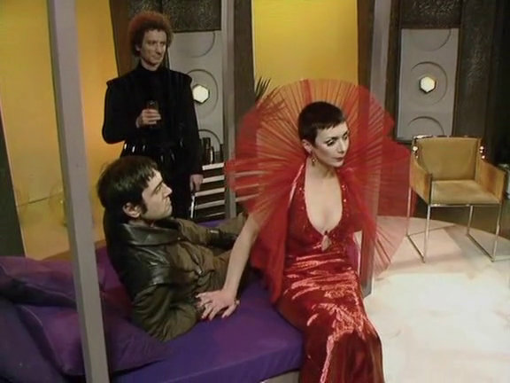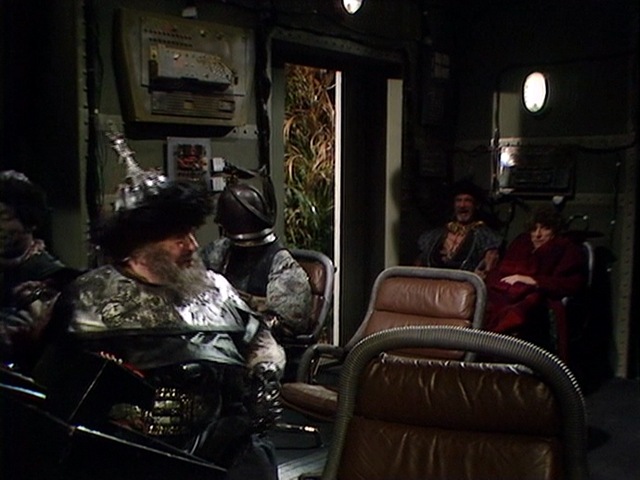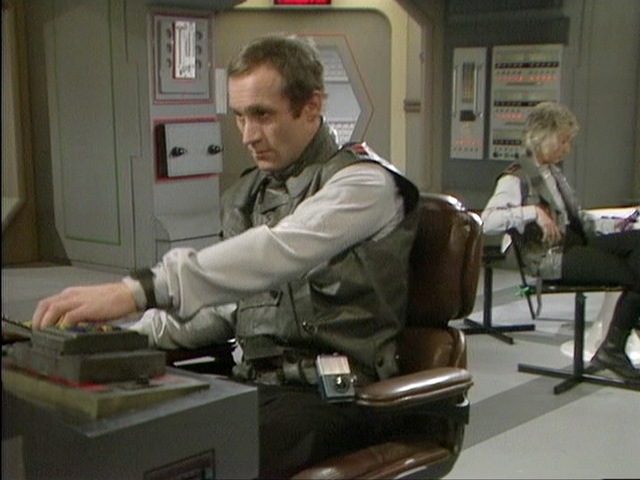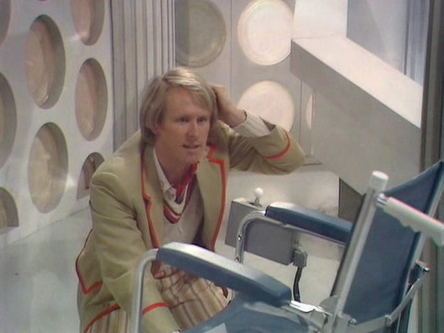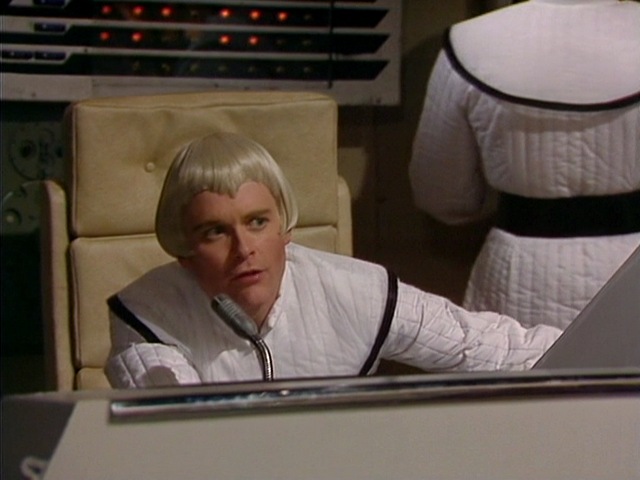 Following the glitz of ‘The Leisure Hive’, it is a jolt to see characters sporting a blond ‘space wig’ which is 10 – 15 years out of date. In this situation, it is important to go the whole hog, and plonk them in a chair that equally suggests ‘ITC telefantasy’. Perhaps fortuitously, I can’t identify this cream leather high backed office chair.