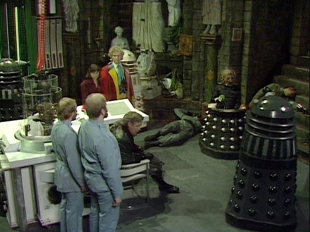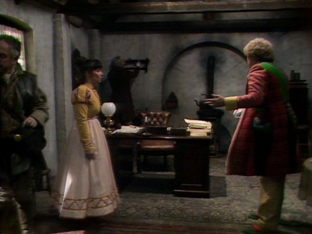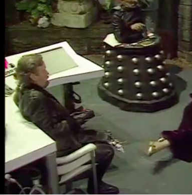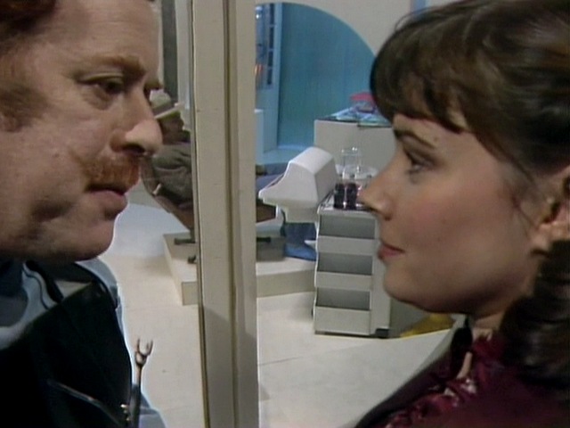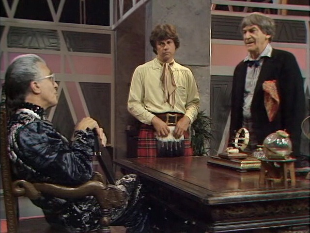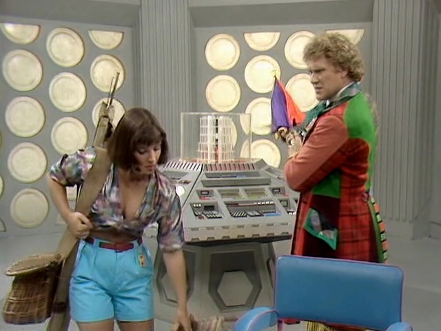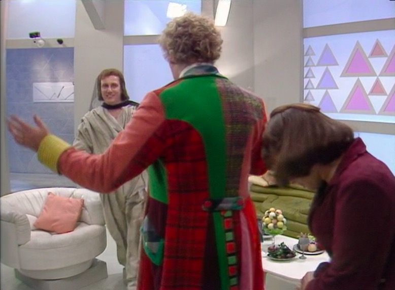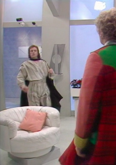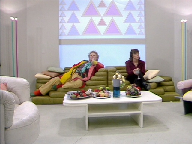 In ‘The Robots of Death’ Louise Jameson goes for the excited childlike ‘plonk’, while here, Nicola Bryant adopts the sophisticated folded legs pose. This leaves us to ponder Colin Baker’s sprawling posture, which suits his character perfectly. He seems to meld into the sofa beautifully, and totally owns it, like the sofa was designed for him.
