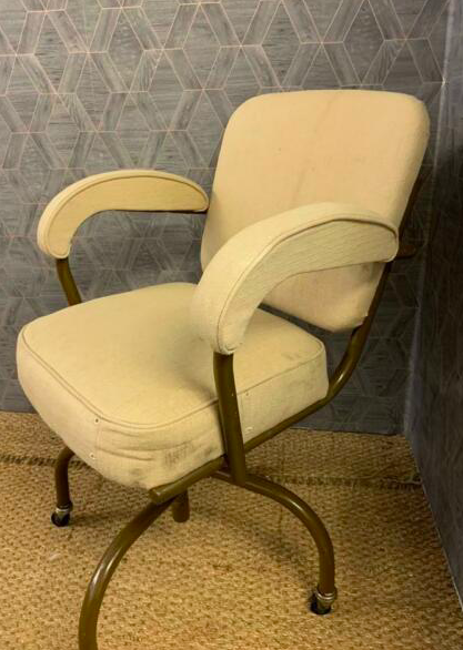 Let’s get the disappointment out of the way first. Currently, this leatherette industrial armchair cannot be identified. It comes from the genus curved armrests, which were commonplace from the 1920s onwards. It shares similarities with the Bauhaus SP9 chair by PEL, and various desk chairs from the first half of the 20th century.