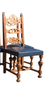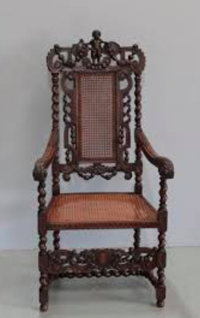 Dastari sits in an ornate carved wooden armchair. I can’t find an exact match, but the armrests are probably the best clue, once I’ve worked out whether its a serpent or griffin design – or something else entirely. Closest guess is a Louis XIII armchair.