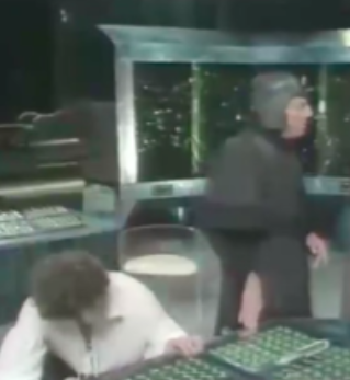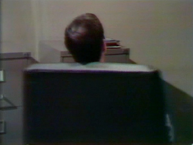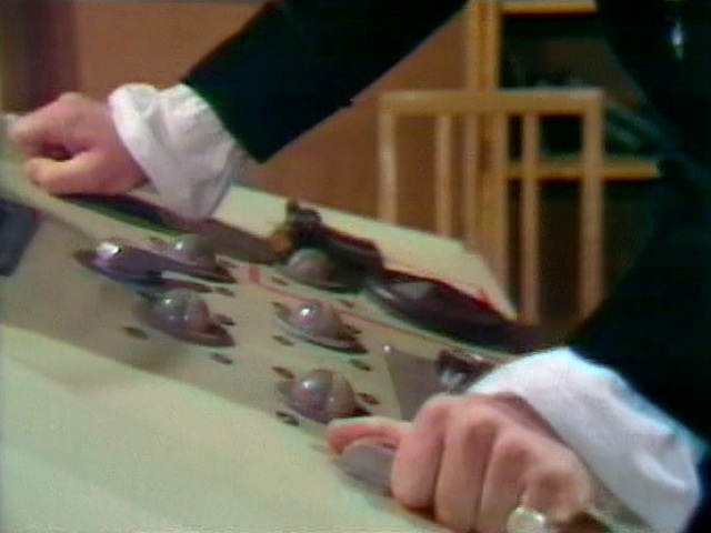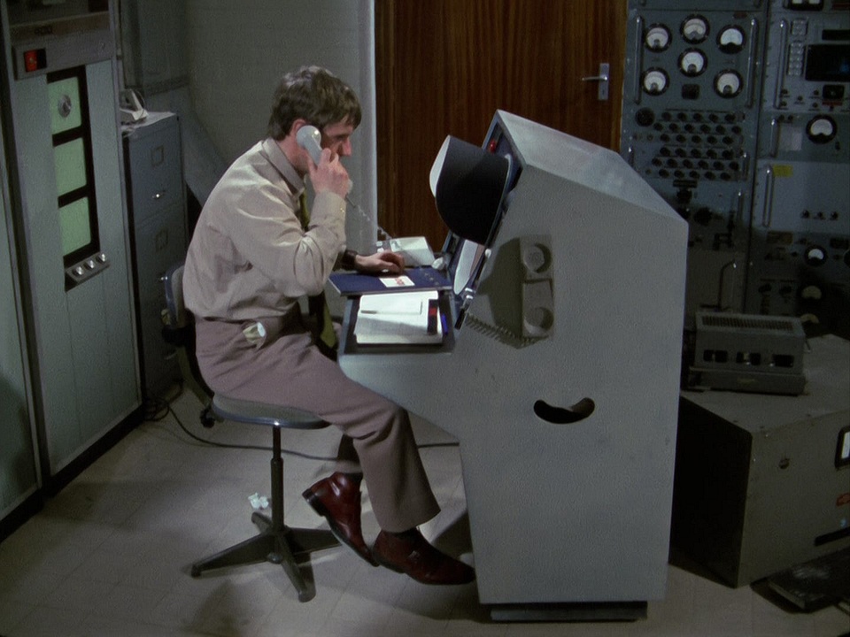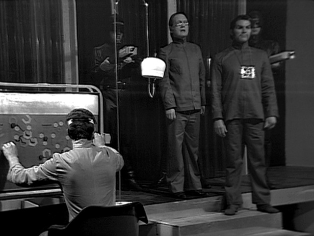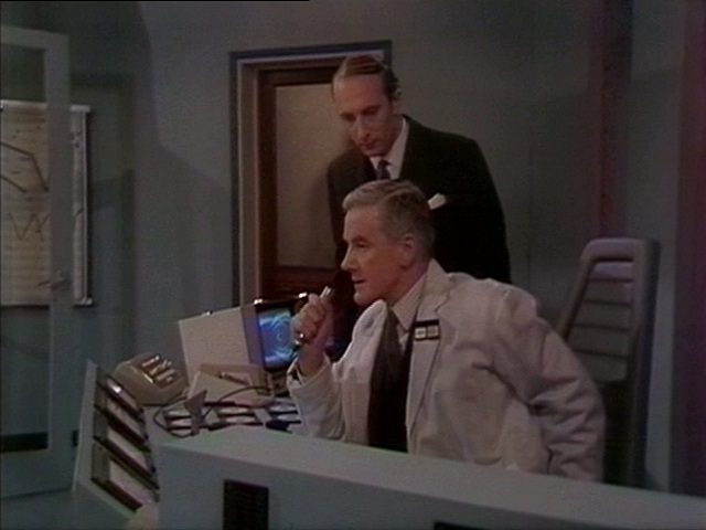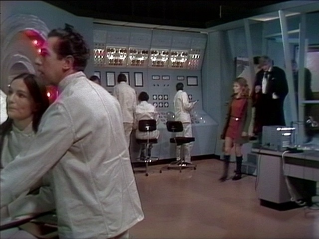 Generic industrial swivelers. Of course I’m talking about the chair here. As an aside, if I’m not mistaken, the two in the foreground are Margaret Pillaeu (think Servalan’s Mutoid aide at the end of ‘Hostage’) and Keith Ashley (think the poor hapless technician that Stahlmann drags and shoves his face into the green goo in ‘Inferno’).