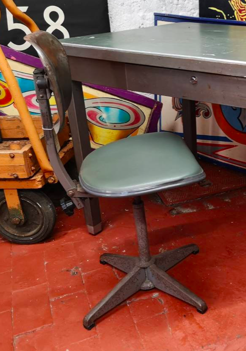 The trusty PEL desk chair designed by Oliver Bernard, probably dating from the 1930s, appears at the factory.