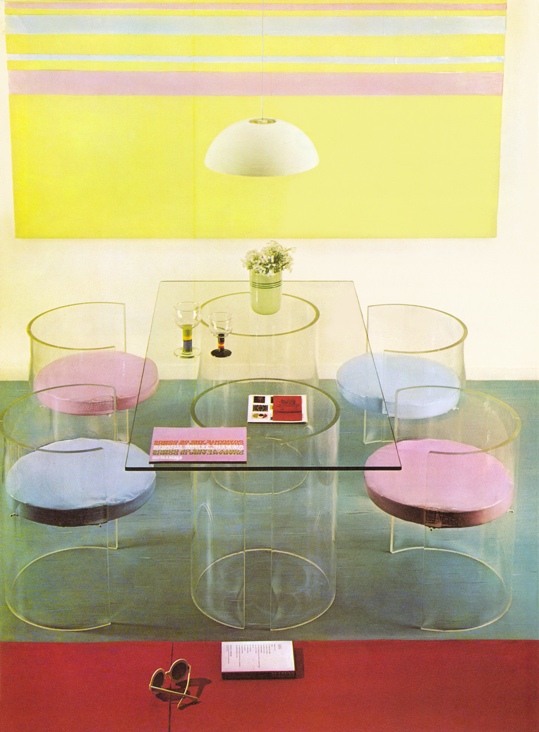 These perspex cylindrical chairs pop up well into the 1970s. They look similar to a number of chairs, including a Charles Hollis Jones Lucite chair (not pictured).