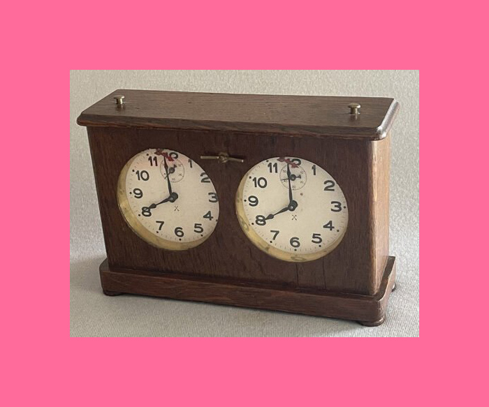 Following consultation with himself, the Doctor is prescribed plenty of rest. So, perhaps a game of chess is in order? Cue this federation chess clock circa 1925 (approx). These timers were used in many clubs and tournaments of all levels throughout the UK in the early to mid-1900s. The clock movements were manufactured by H.A.C, the Hamburg American Clock Company (1883-1929). This German company produced clocks of all types using many American methods and designs.