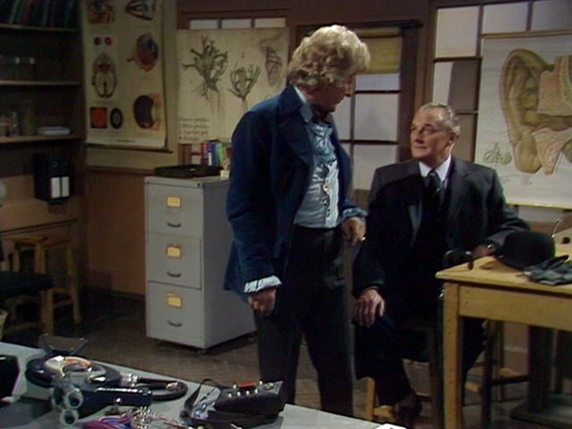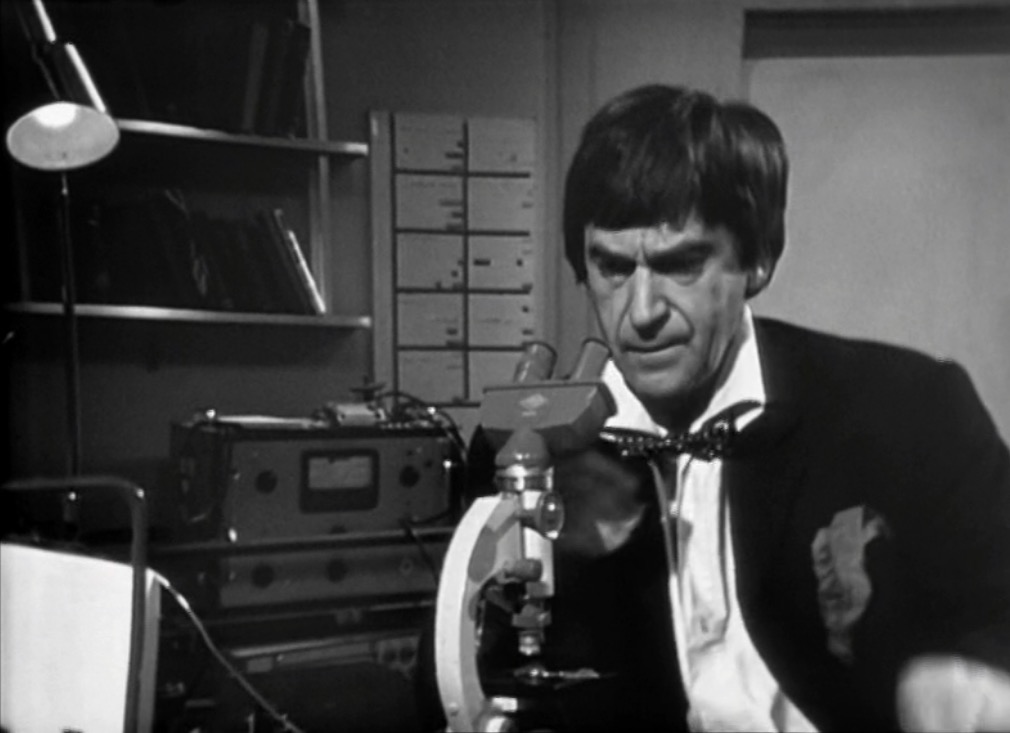 A couple more microscopes to finish. Firstly, one that can be identified. This publicity shot for ‘An Unearthly Child’ features Ian and this Zeiss Winkel Monocular Microscope – the serial number suggests post WWII.