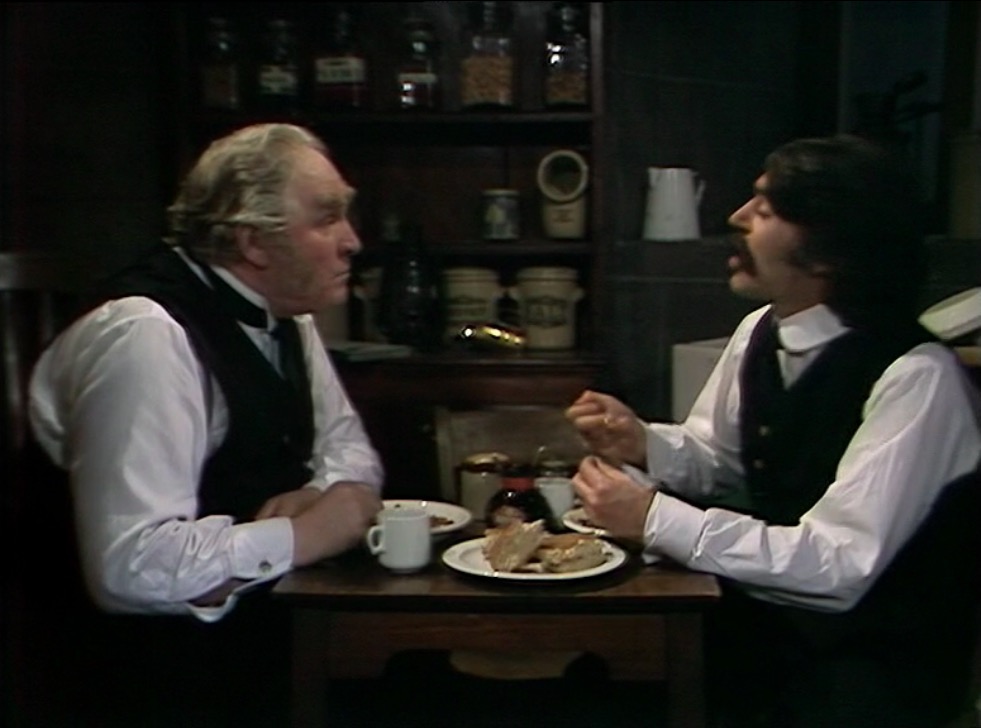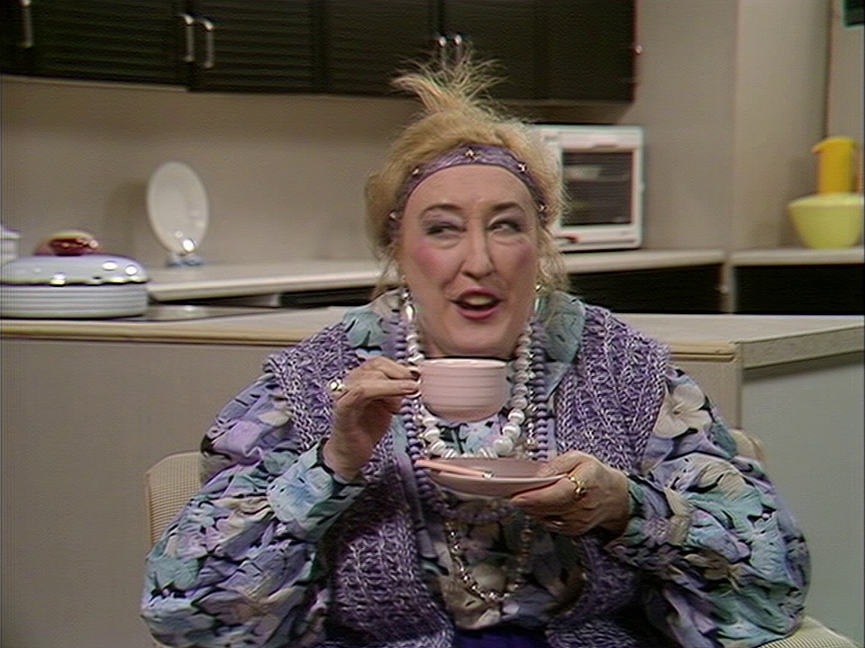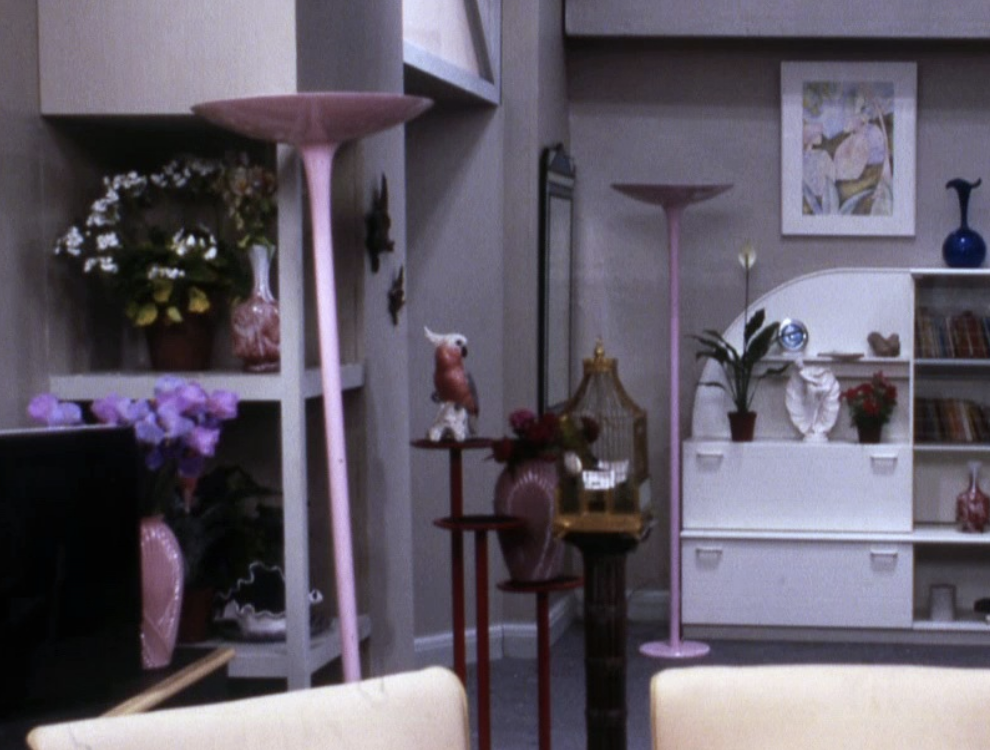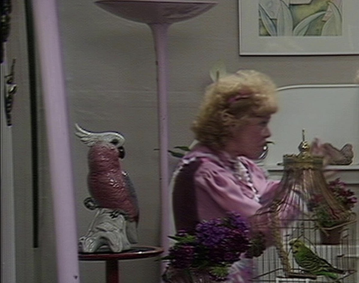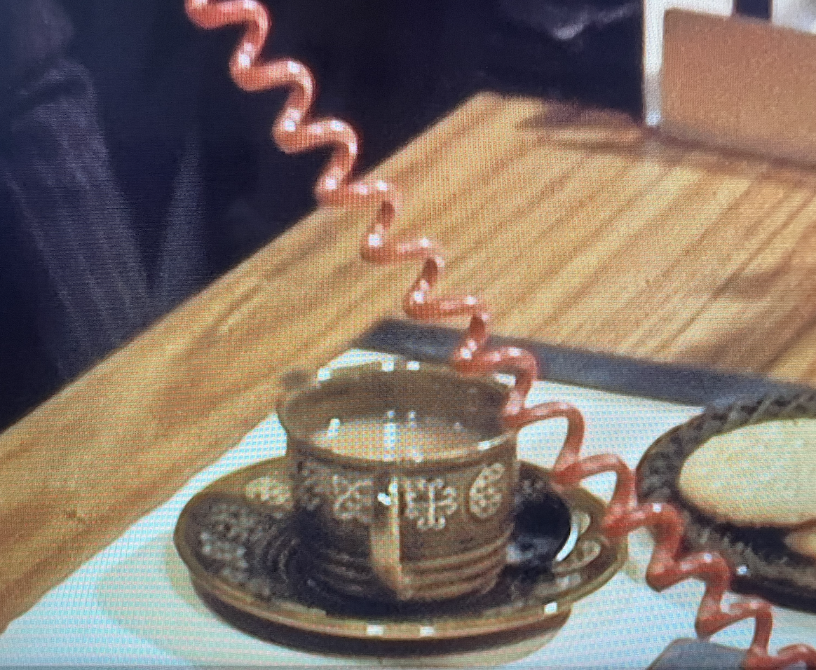 On to afternoon tea now, and Mel enjoys the immaculate presentation offered by Tilda and Tabby of apartment 1236 Paradise Towers. Here we see a pink ‘Swan lake’ dinner set, first produced in 1983 by Hornsea Pottery, and available in stone white, pink and grey. Hornsea Pottery was created in 1949 by two brothers called Desmond and Colin Rawson, and survived until 2000.