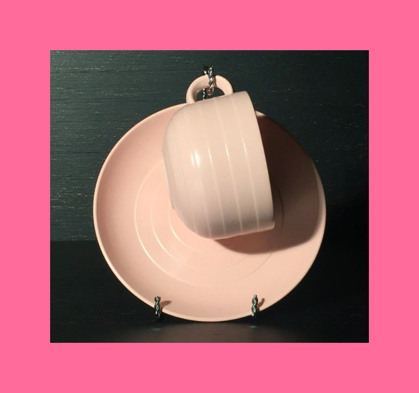 Coffee or tea? Mike Yates sups on this Celtic tea cup and saucer, Lord Nelson Pottery, London , 1960s. I thought that would go against Global Chemicals brand of efficiency.
