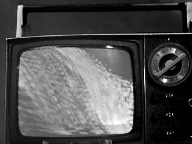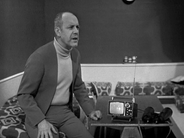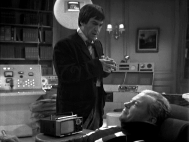 To the Doctor’s laboratory now, and episode 1 of ‘The Ambassadors of Death’. This wooden Goliath is a Decca CTV25 Dual Standard Chassis TV, the kind of object that would remain intact within a raging inferno. This leads neatly to…