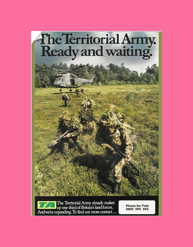 After all that romance, it’s time to put feet firmly back on the ground, with this colour photolithograph recruiting poster, published by the Armed Forces Careers Office for the Territorial Army. ‘Ready and waiting’ dates from 1987.