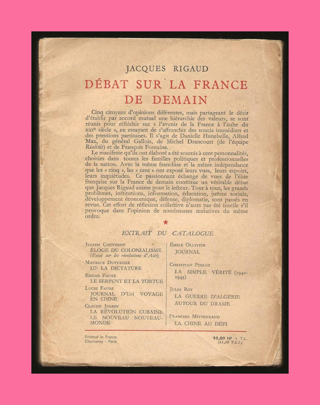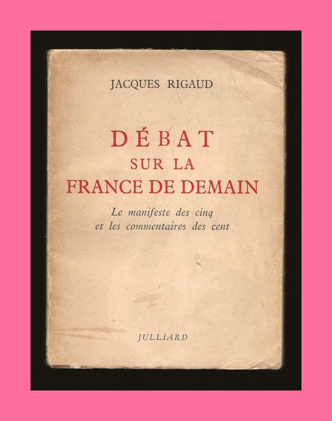 Back to Paris now, and a bit more of a heavy read is ‘Débat sur la France de demain – le manifeste des cinq et les commentaires des cent.’ Published by René Julliard, 1961. This is loosely translated as a debate about the France of tomorrow – a manifesto of 5 and a commentary of 100.