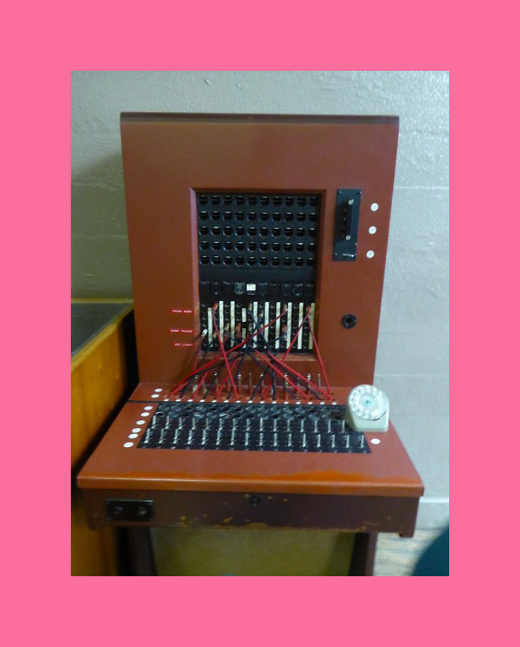 Moving on to the shorter distance communication now, and Grover and co. use this unmarked Ivory standup 12-button desk intercom. One listing simply describes this as “commonly used in department stores“.