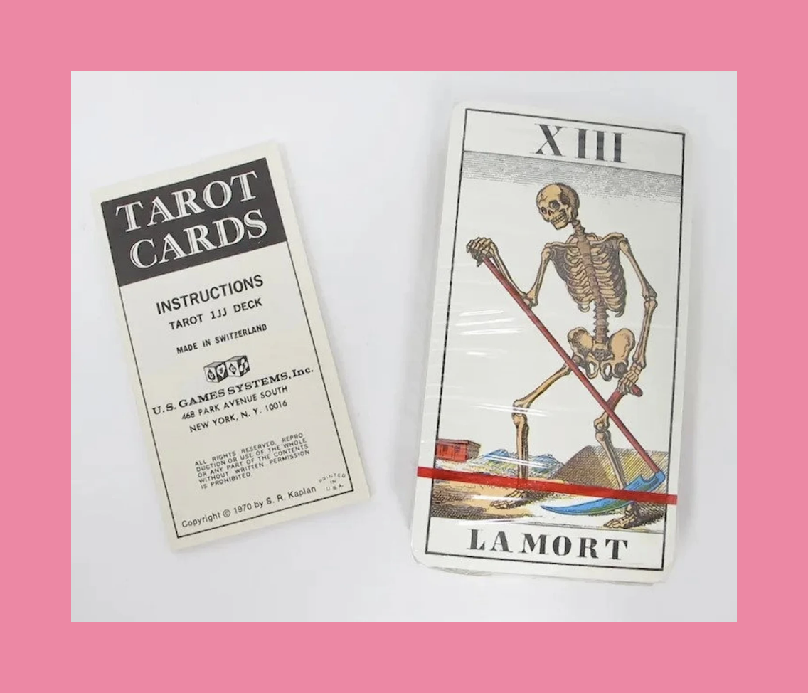 From the floor to the table. In Ma Tyler’s cottage, we can see 1JJ Swiss Tarot, first published in 1831, This is a 1970 edition, published by Muller in Switzerland and distributed by U.S. Games Systems. It’s based on the ancient Marseilles deck. The two J’s in the title refer to Jupiter and Junon, the Roman equivalents of Zeus and Hera, who in this deck were substituted for the Pope and Popess so as not to offend the Catholic Church.