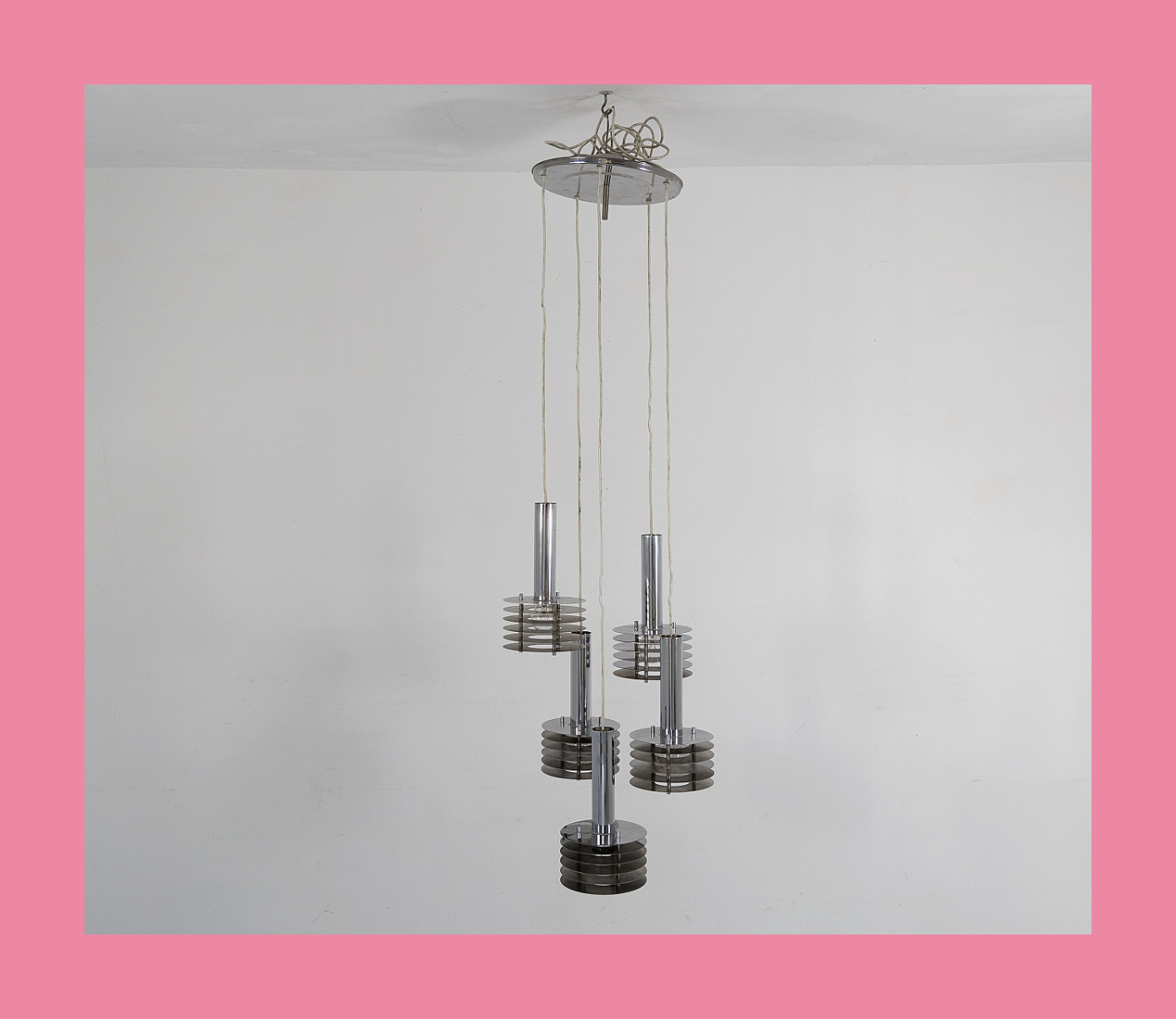Elsewhere, the Draconian embassy HQ features this Italian, 1970s, Chromium-plated 5-point chandelier in Space Age style. Designer unknown, listed as in the style of BPS Leuchten-Systeme by Rolf Krüger.