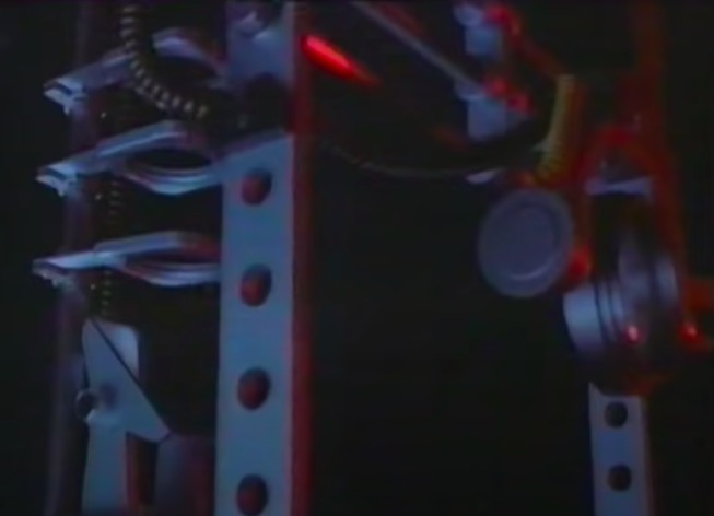 Other elements included the rotating screw thread based on one of the rig’s drive shafts, and the orange computer screen which was the plasma screen of the Interactive Motion Control (IMC) system that controlled the rig – you can see the relevant filmaking terms – focus, East/West, North/South, pan, tilt, roll, track etc.