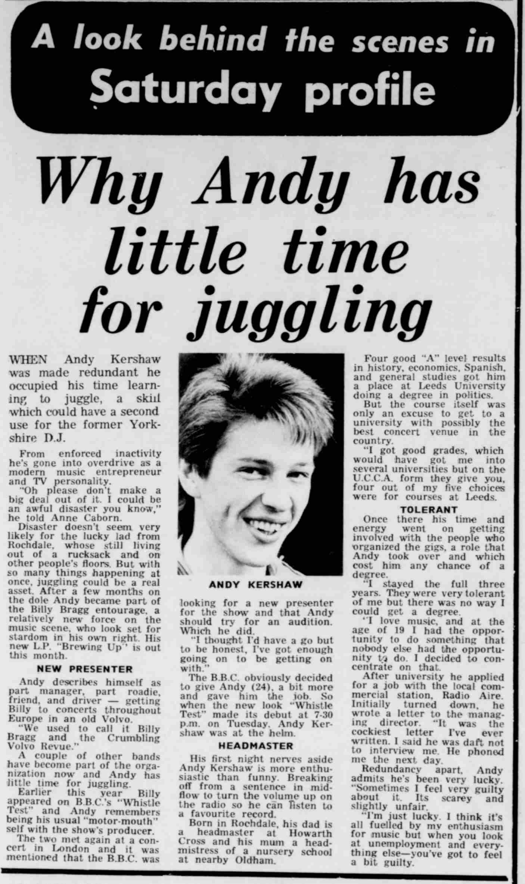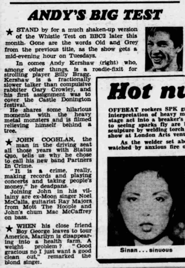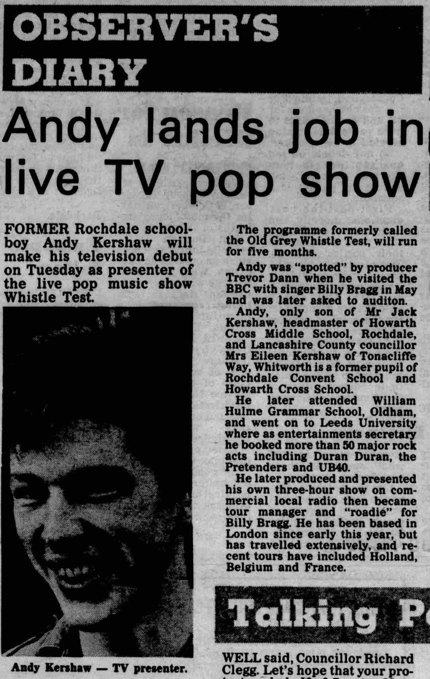 The new live series introduced fresh faces in front of the camera. At the same time, Jon Lewin’s article about the previous series in One Two Testing magazine was written (see part 2 of this story), Billy Bragg was booked to play Whistle Test, and brought his roadie with him. His name was Andy Kershaw.