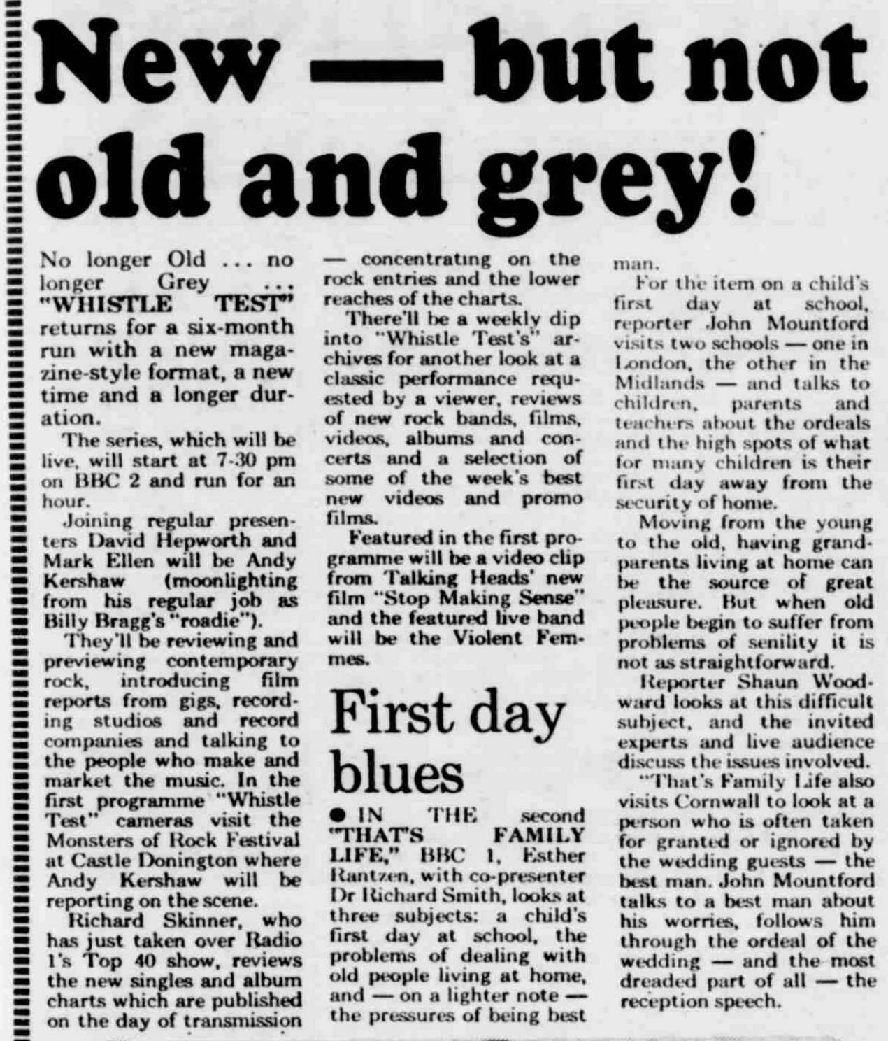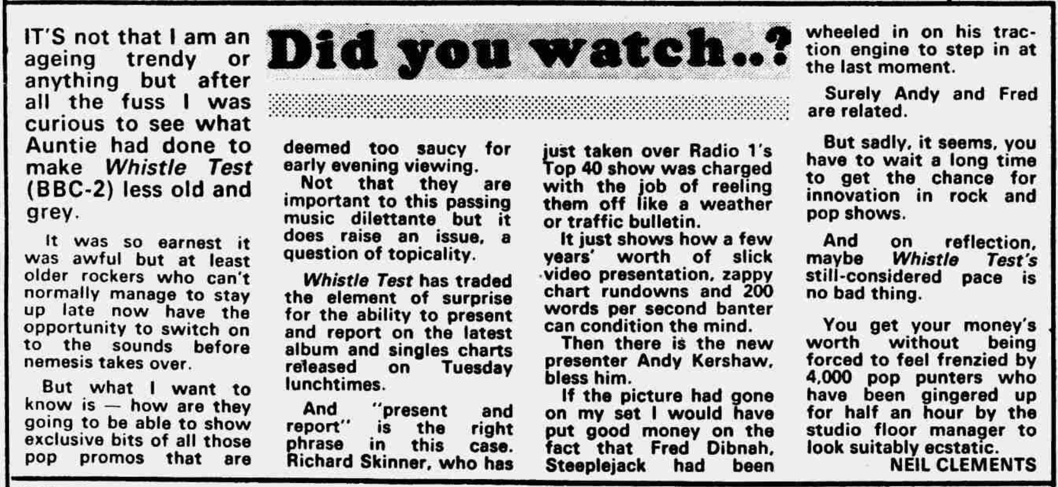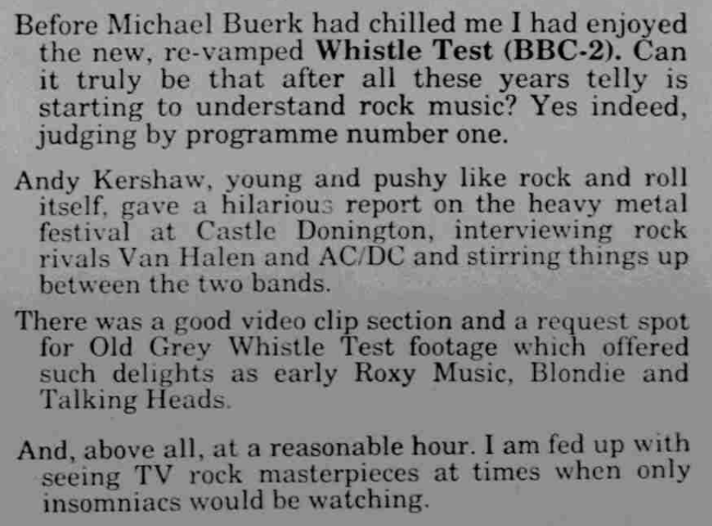 The all-new Whistle Test had launched successfully, attracting strong viewing figures and some begrudingly good write-ups. The tabloids and the odd broadsheet focused largely on the new recruits – Kershaw and Skinner. It even muted overt criticism from the music press for a while. If that was a measure of its success at the time, then so be it.