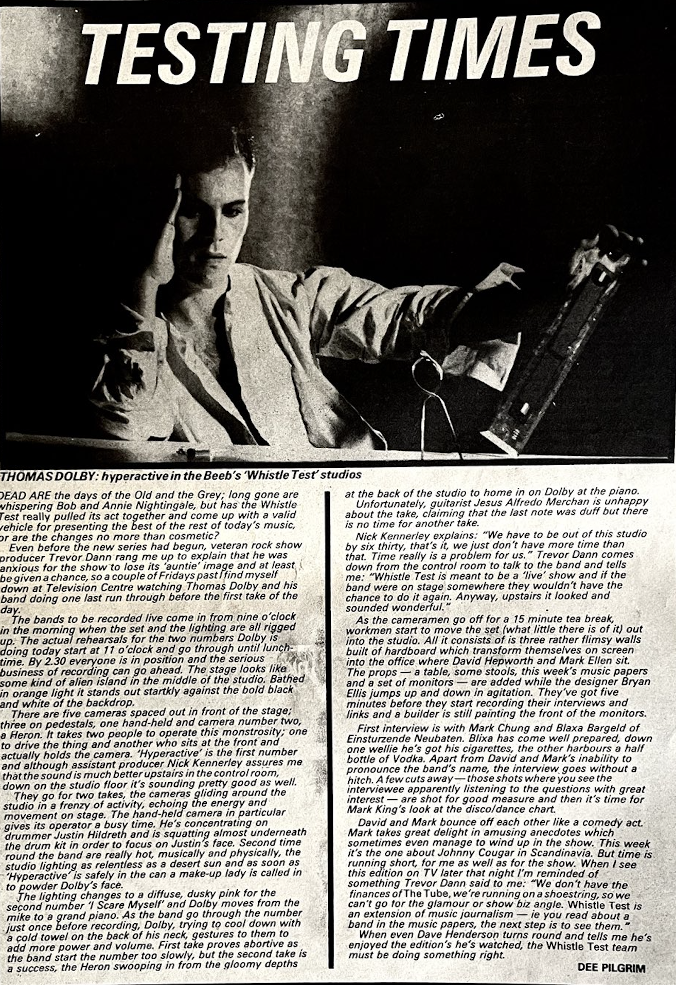 The 11th February issue of Sounds notes that more than one take of Thomas Dolby’s ‘Hyperactive’ was recorded. A ‘luxury’ of a pre-recorded show was the opportunity for multiple takes if required. A glance at the final transmission reveals that occasional cutaways from one take could be spliced into another.