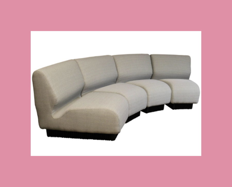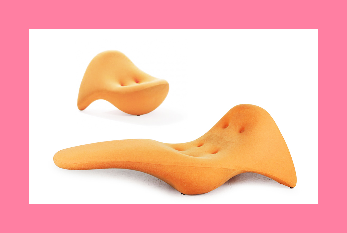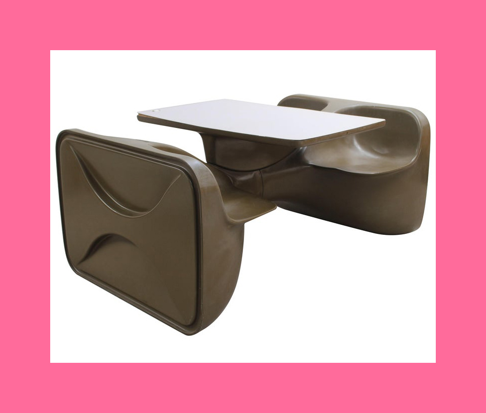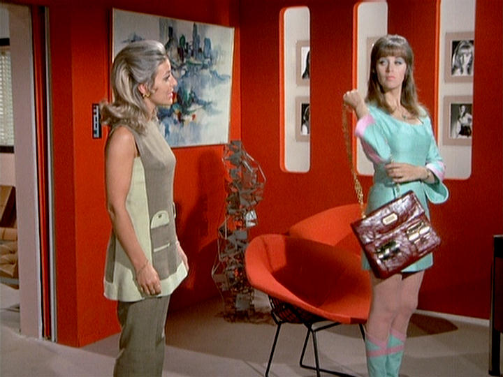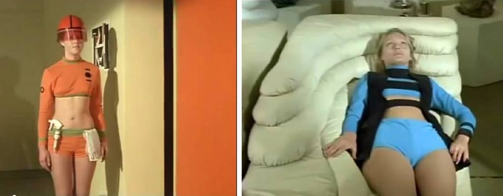 In keeping with the title of the episode, one of the settings on Venus is a space travel waiting room adorned with futuristic details such as a framed slogan ‘Venus is the future’, patterned wallpaper, and an intriguing molded fibreglass chair unlike anything I’ve seen before. I say chair, but the triangular design that allows more than one person to sit on it lends itself to any multi-use communal space.