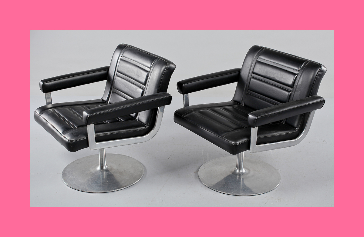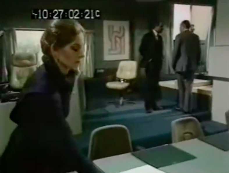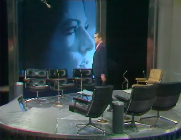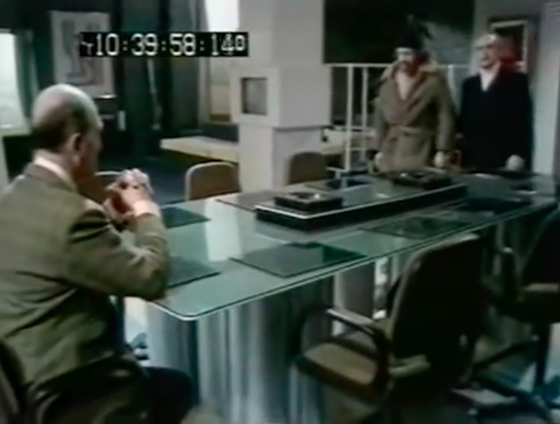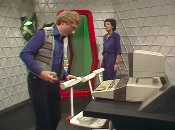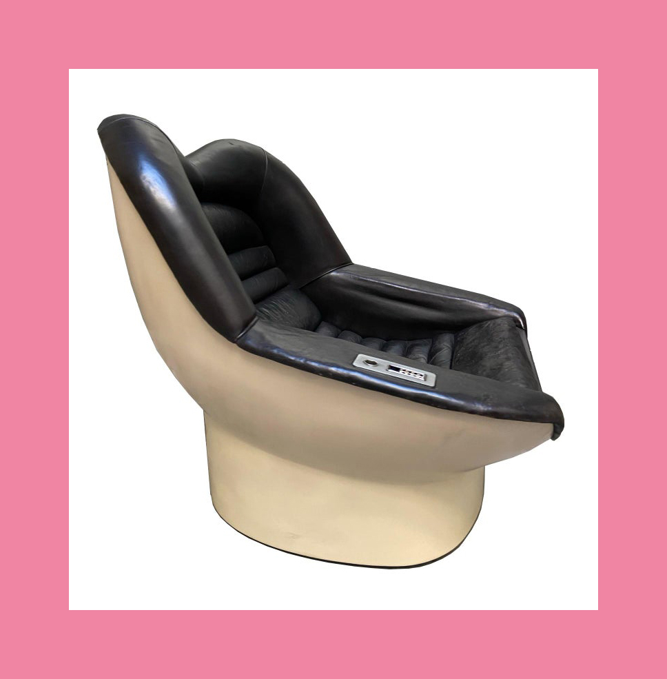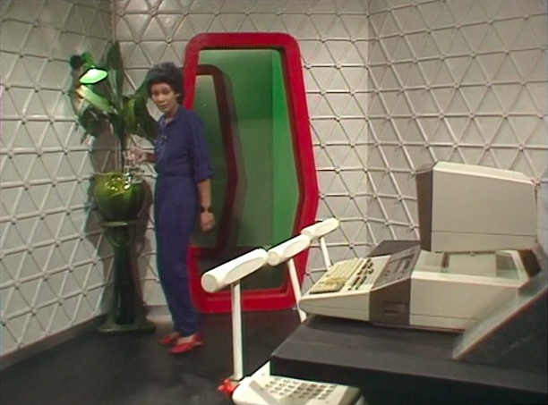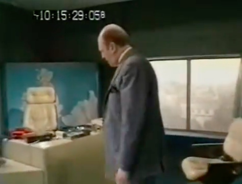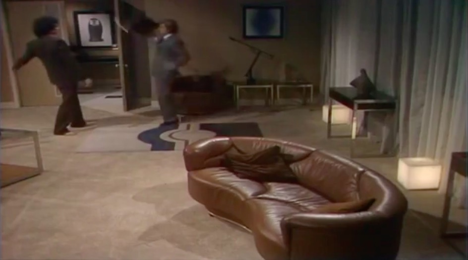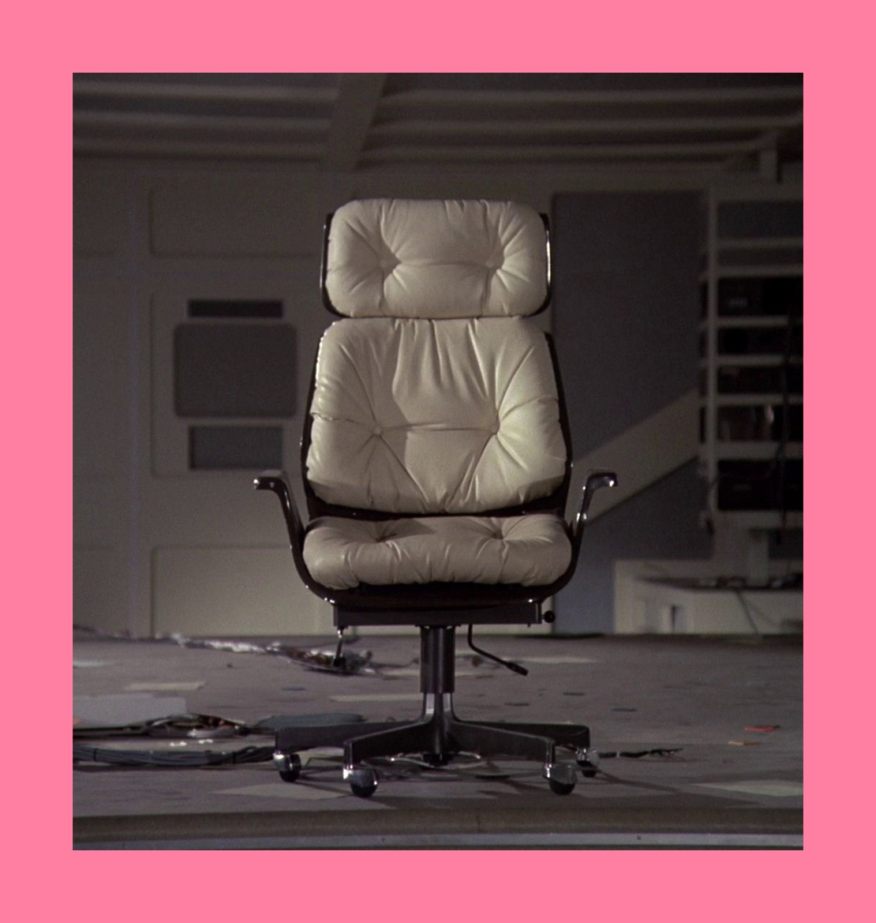 This leads neatly to the second reason, the distinctive visual appearance. The upholstered leather and padded headrest appear to work in unison with the rest of the set design, with televisions fitted into a desk that is equally padded in black leather. It’s one of the few set designs of the era where the furniture is compatible with the rest of the set.