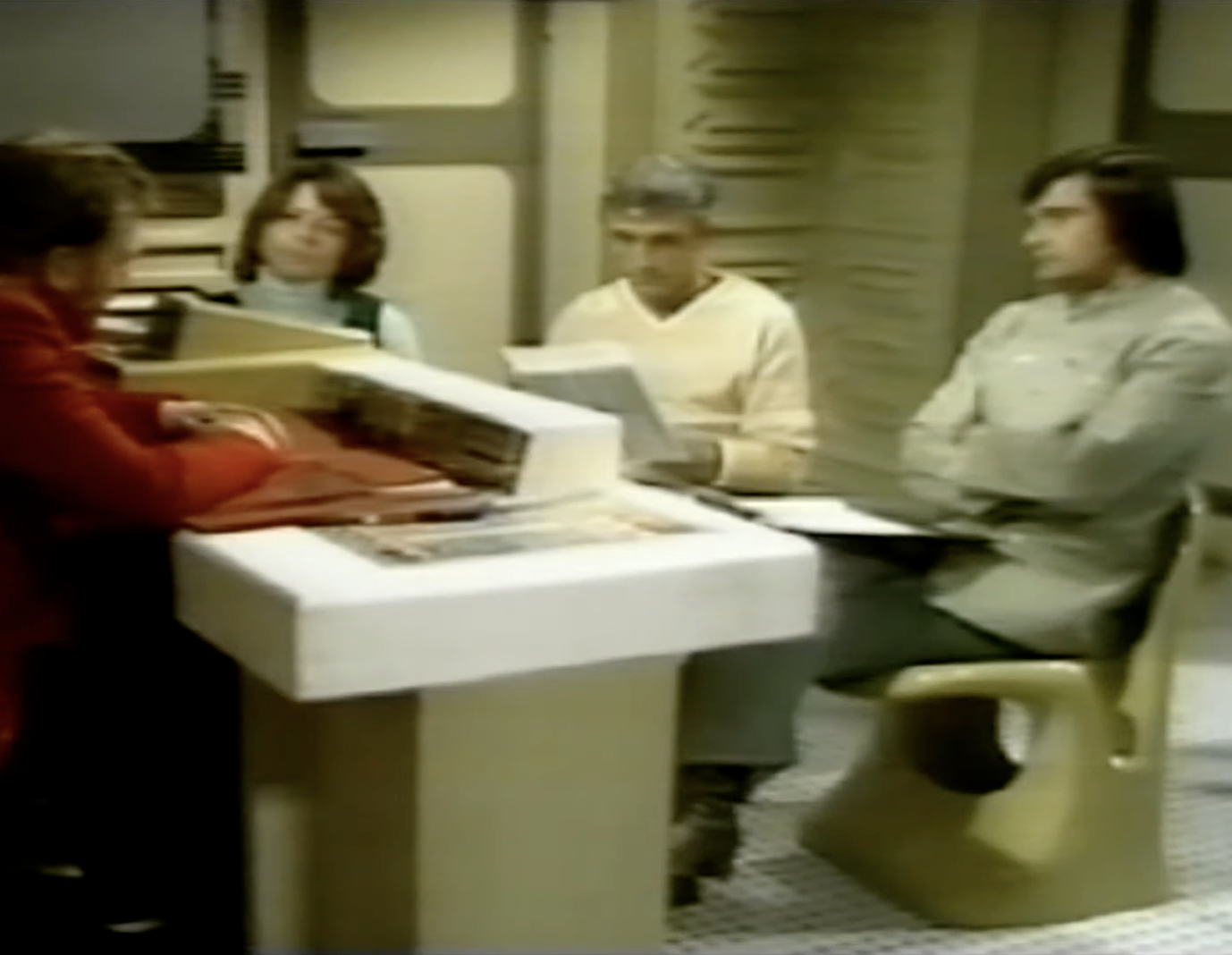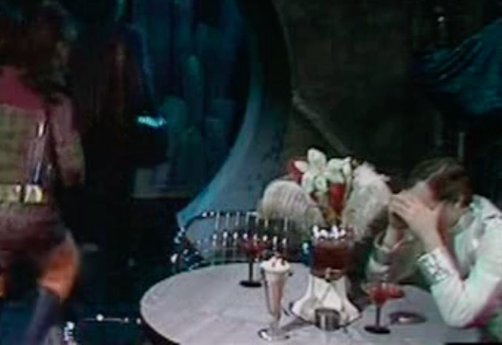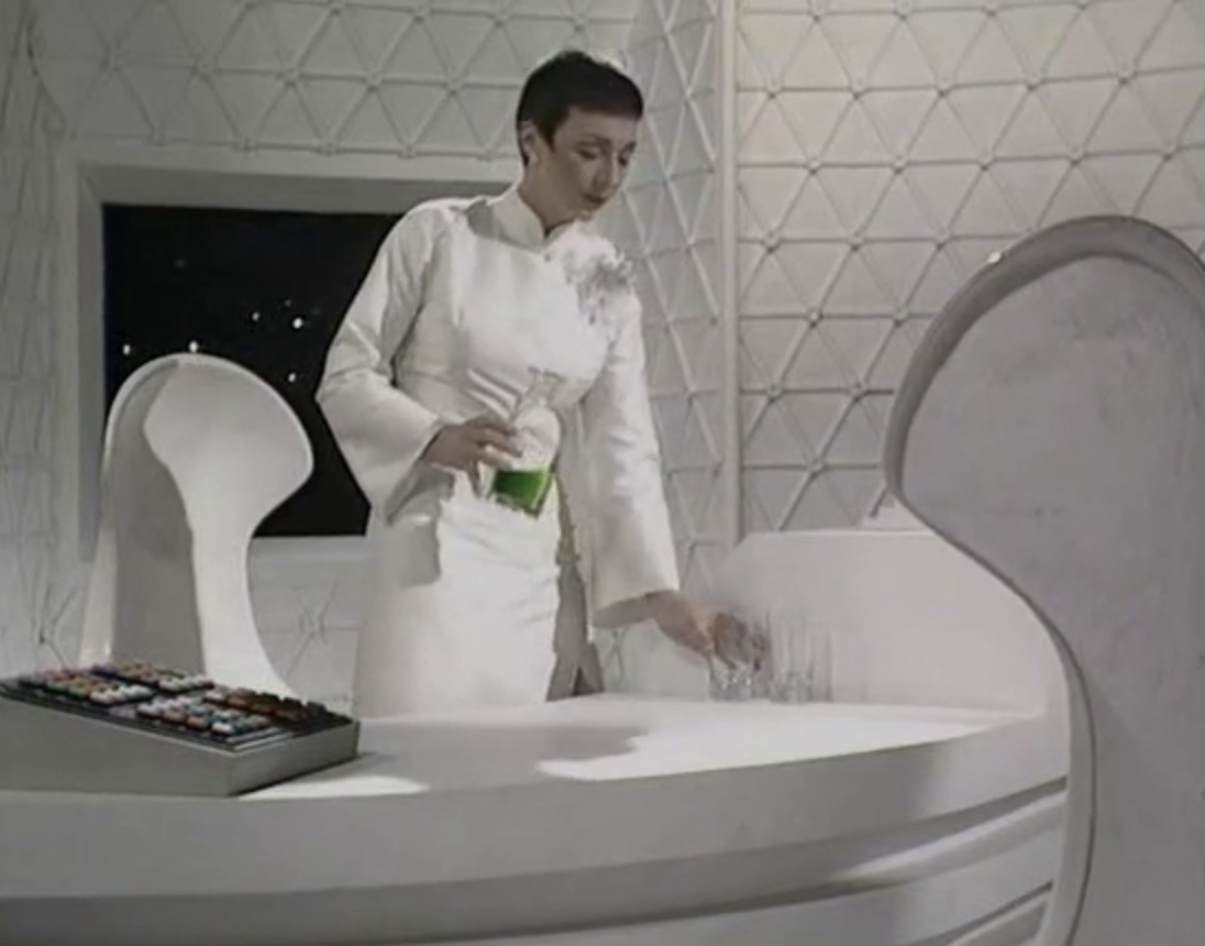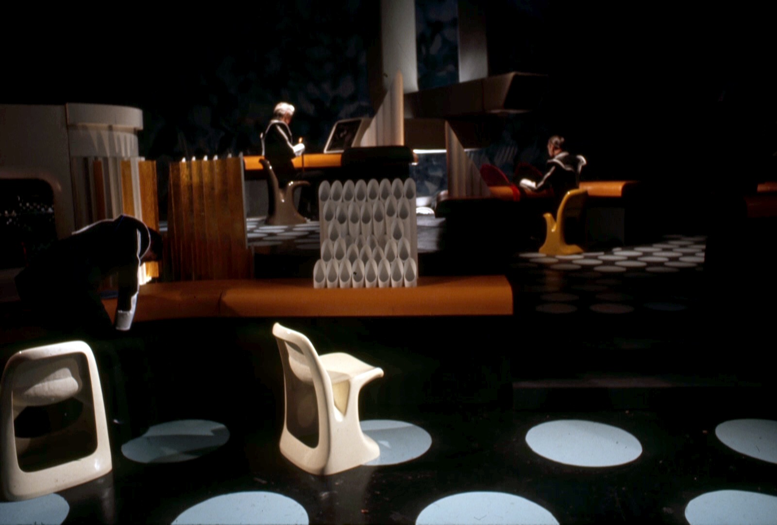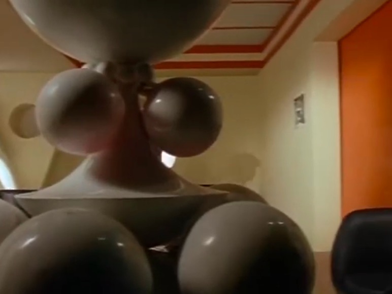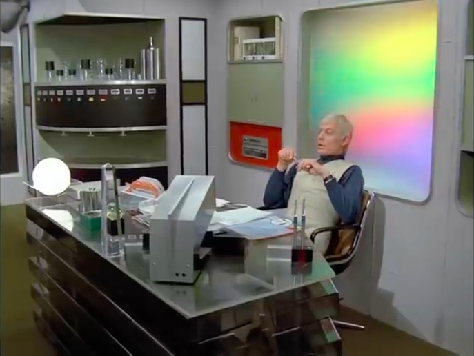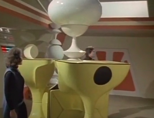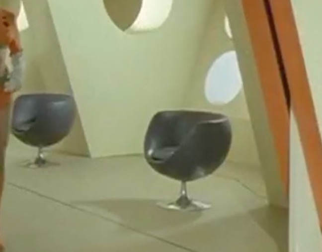 The history goes something like this; the modernist brave new world of the 1960s gives way to the potential for mass production and duplication. The ability to control materials more economically results in ever more sophisticated forms, with the 1970s being the epoch of ‘space-age’ design. This is mirrored in the world of telefantasy, with fibreglass increasingly moulded into furniture to suit the needs of the television production, rather than relying on commercially available chairs.