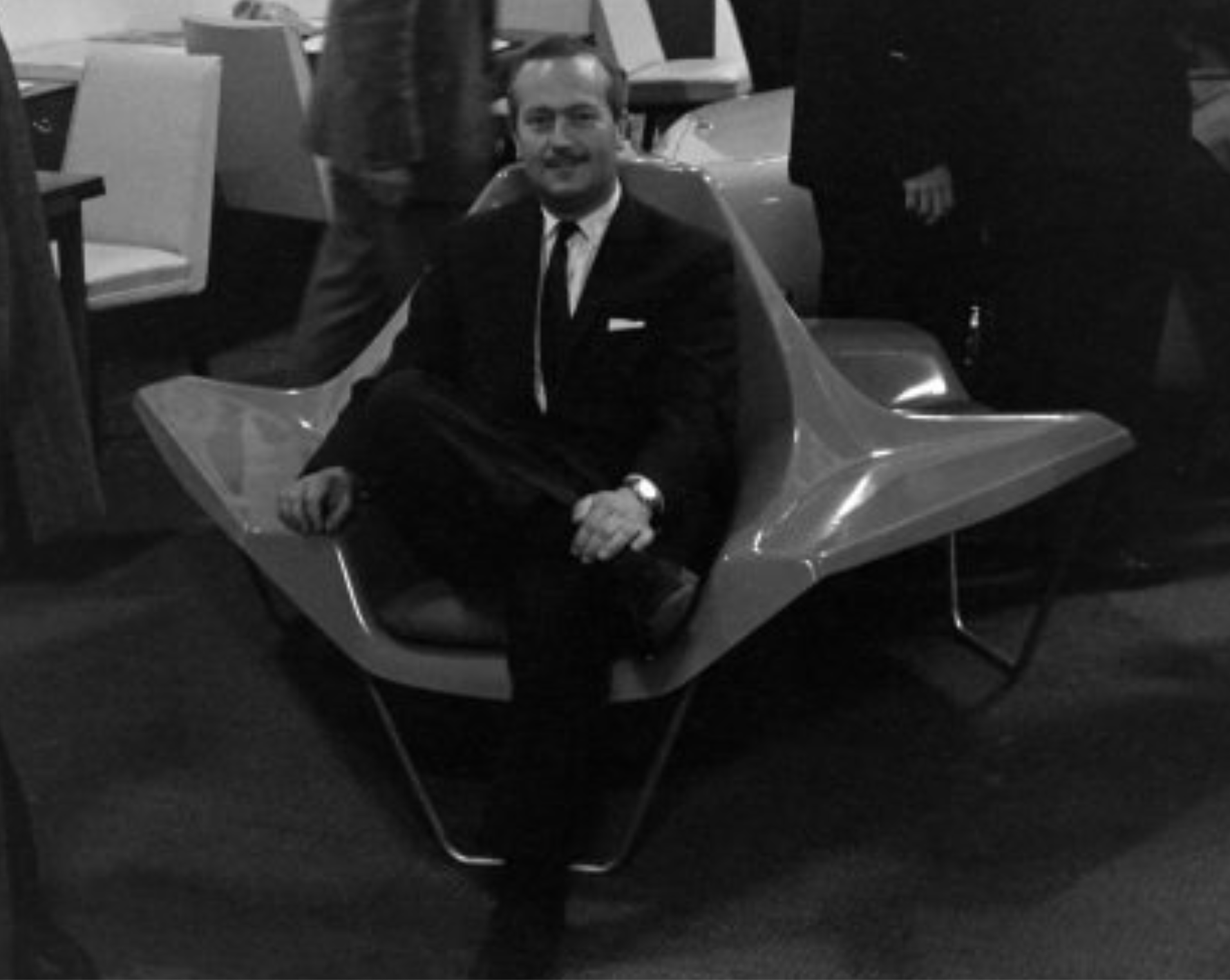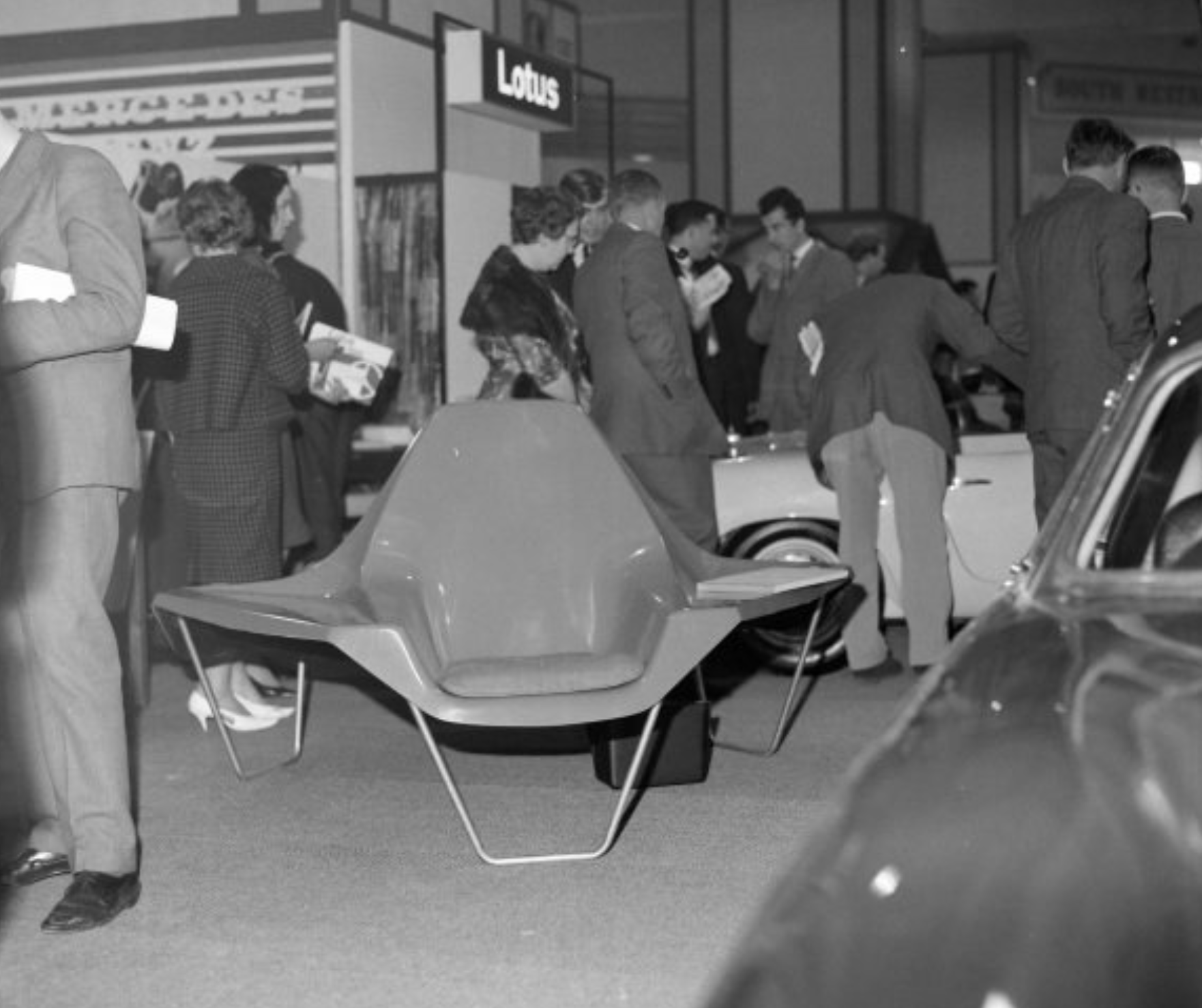 Just as I gave up hope, I came across these photos from the 1962 British Motor Show at Earls Court in London 1962. The listing notes a new lightweight chair developed by the Lotus automotive company.