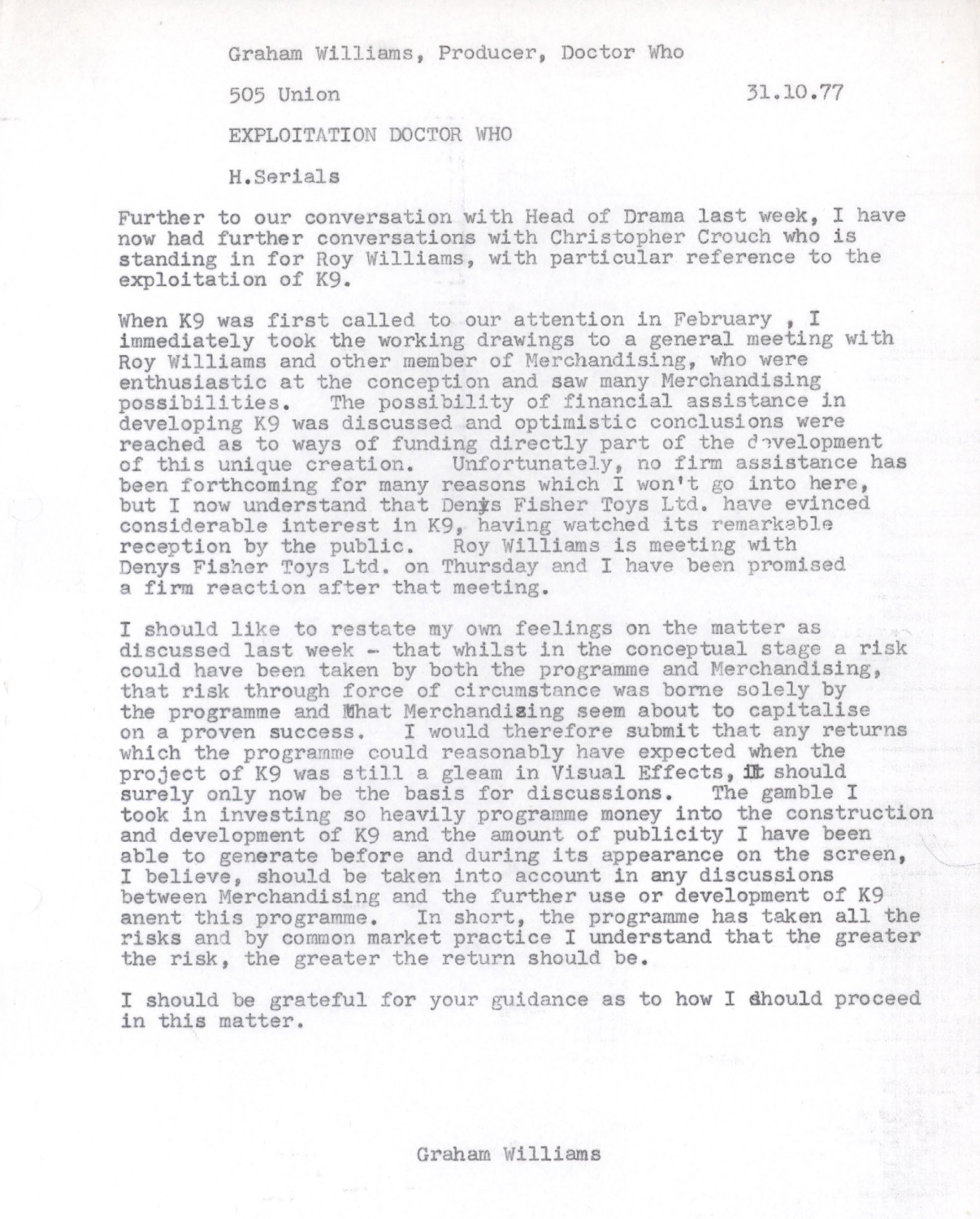 Bignell, R., (2024). âDoctor Who – The Collection. Season 15 – Production Documentationâ [Memo between Williams and MacDonald, and K9 designs.].