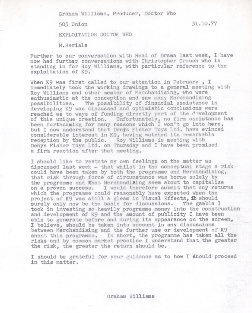 Bignell, R., (2024). “Doctor Who – The Collection. Season 15 – Production Documentation” [Memo between Williams and MacDonald, and K9 designs.].