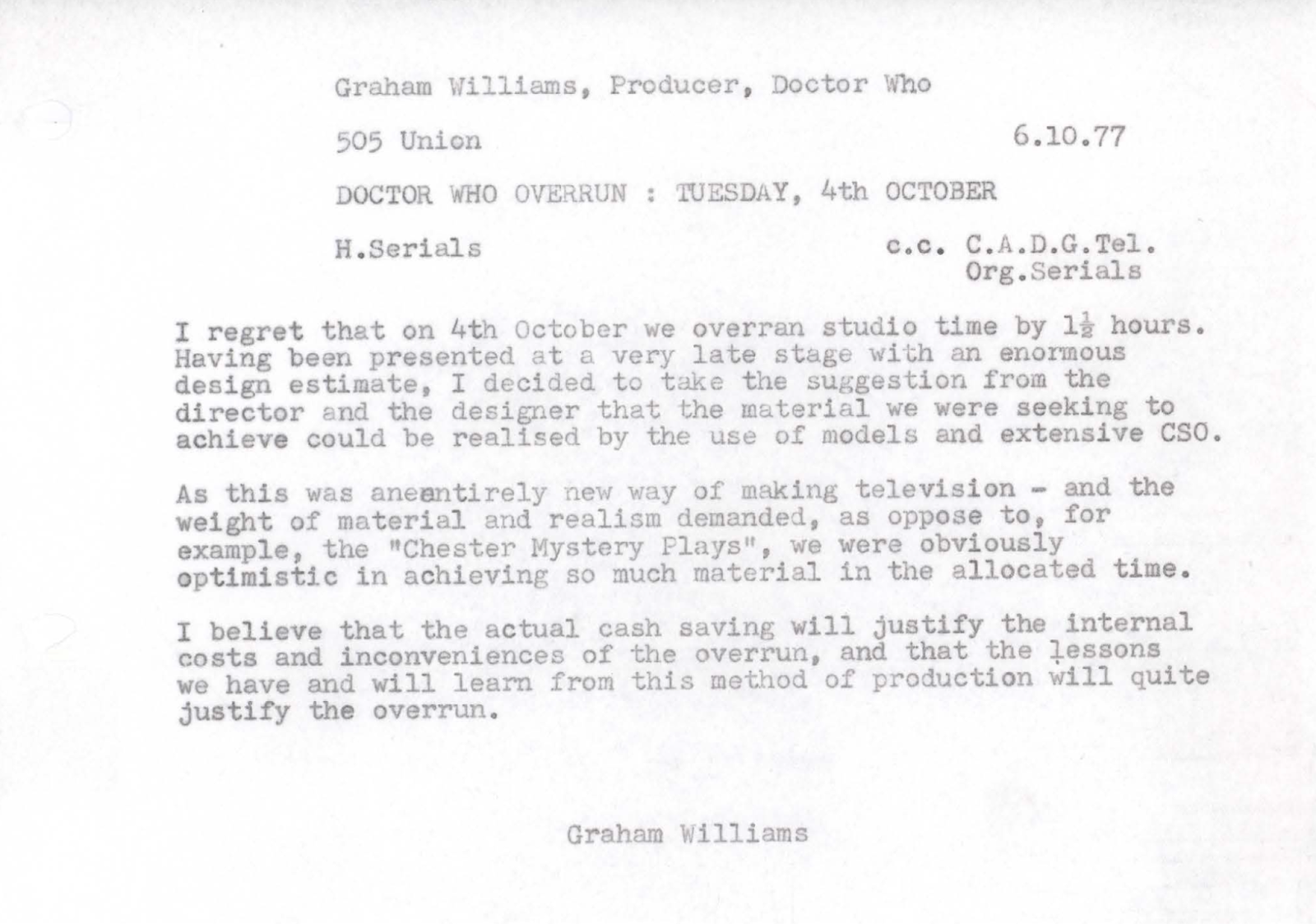 Bignell, R., (2021). âDoctor Who – The Collection. Season 17 – Production Documentationâ [Memo between Williams and MacDonald.].