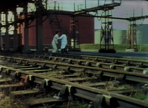 And then, there the editing – always so sharp. This includes the vision mixing (the on-the-fly editing between cameras in the electronic studio). However, it’s Camfield’s use of Eistensitenian collisions that is of interest. A celebrated example is from Doctor Who, ‘Inferno’, where he cuts from Scocum’s frenzied attack on the technician, to Benton hammering a nail. It’s a cut that suggests much about the tale that is about to unfold – full of aggression and an uncompromising tone.