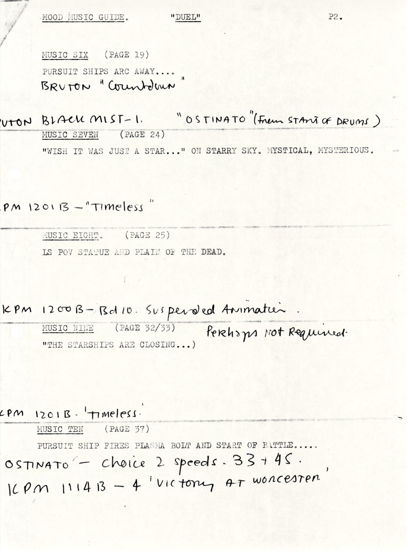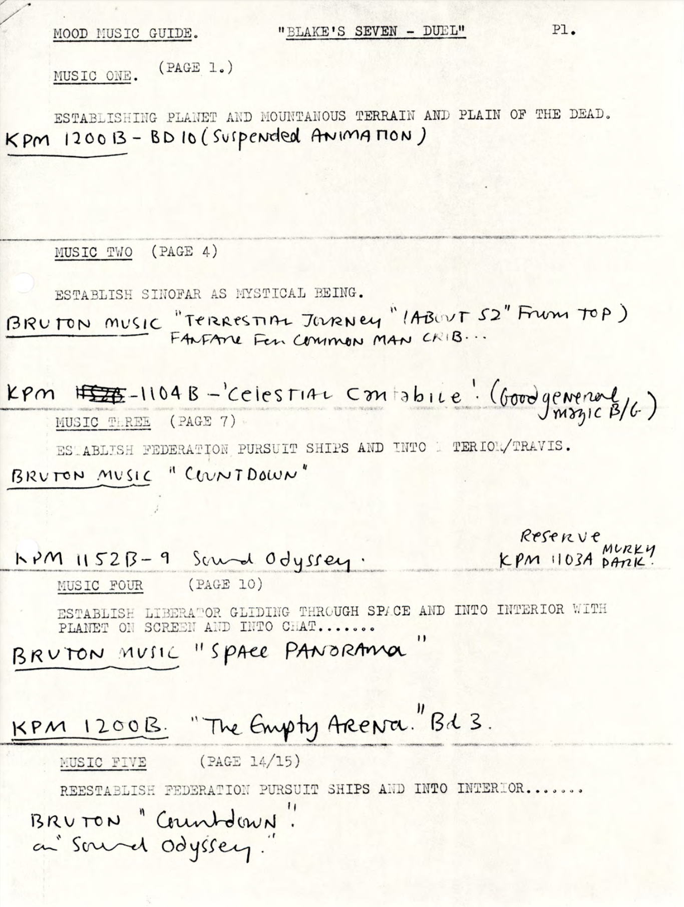Also identified as a reserve was ‘The Empty Arena‘ by Keith Mansfield, from the KPM LP ‘Olympiad 2000’ (1977). This track is slightly more Star Trek in nature, beginning with a series of high-octane notes before moving into a more synthesised and triumphant melody. Watch the video later in this chapter – it’s interesting to note how differently the audience might have interpreted the Liberator flying through space if one score replaced another.