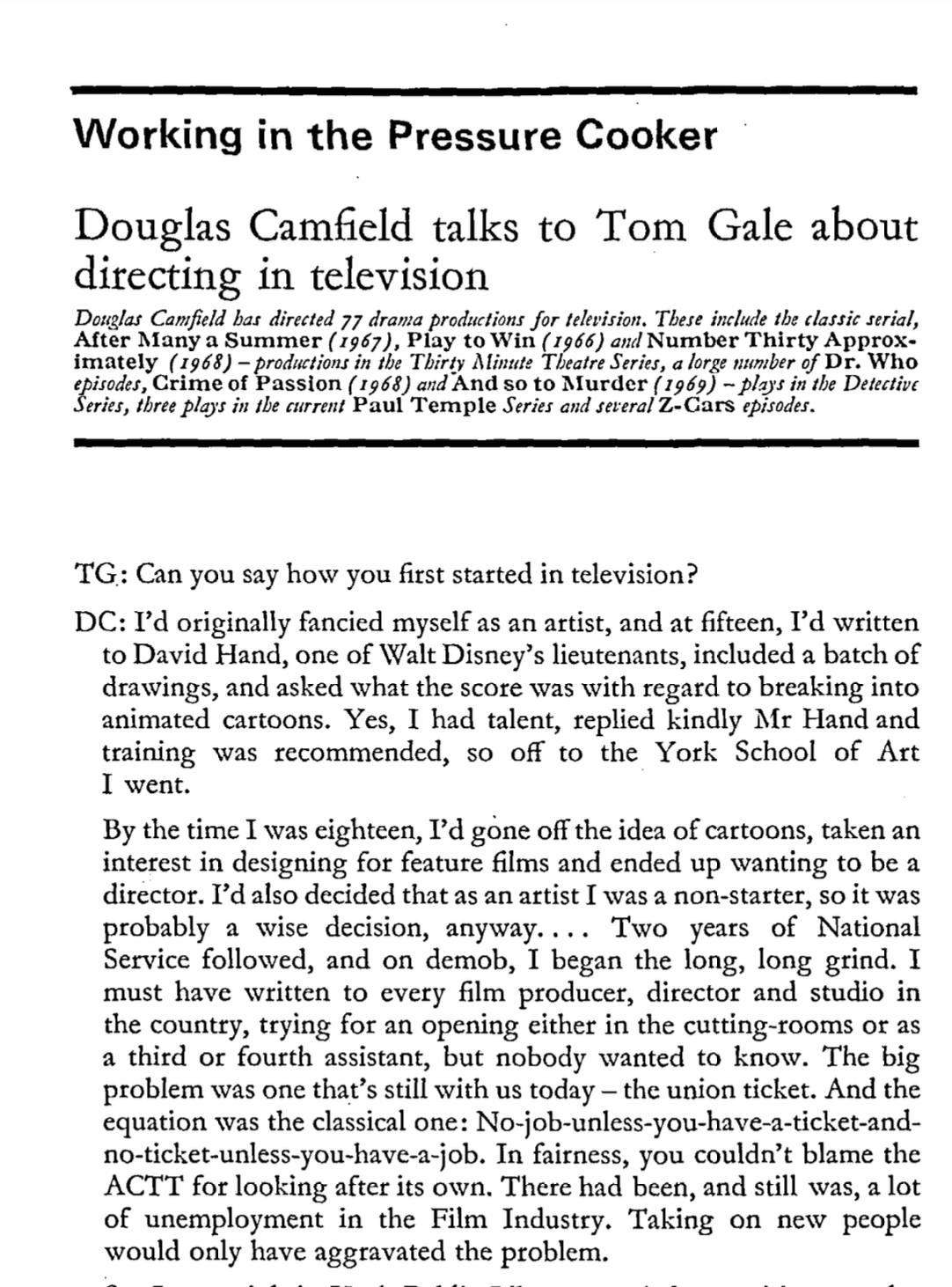 - Gale, T (1970) Working in the Pressure Cooker – Douglas Camfield talks to Tom Gale about directing in television in Screen Vol. 11, No. 2 ↩︎