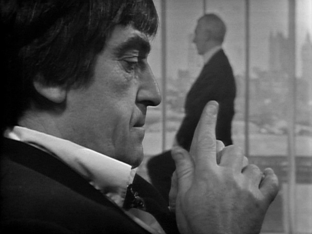 In the same vein, there is the cut in ‘The Invasion’ from the Brigadier wishing Captain Turner well, as he attempts to rescue Professor Vaughn from International Electromatics, to the dishevelled Gregory, who relays how the very same event unfolded. The fact that we don’t see the actual event occurring was due to the film unit running out of time on location. However, Camfield’s marrying up of the two shots – the same position, with one character full of optimism, and the other full of pessimism- is a novel way of highlighting the off-screen event, and positions us right in the middle of the before and after. The fact that this has been described as a confusing cut in some quarters (by both members of the cast and in fan reviews) suggests to me that this type of filmic language was at odds with the established sequencing and pacing of a multi-camera Doctor Who episode.