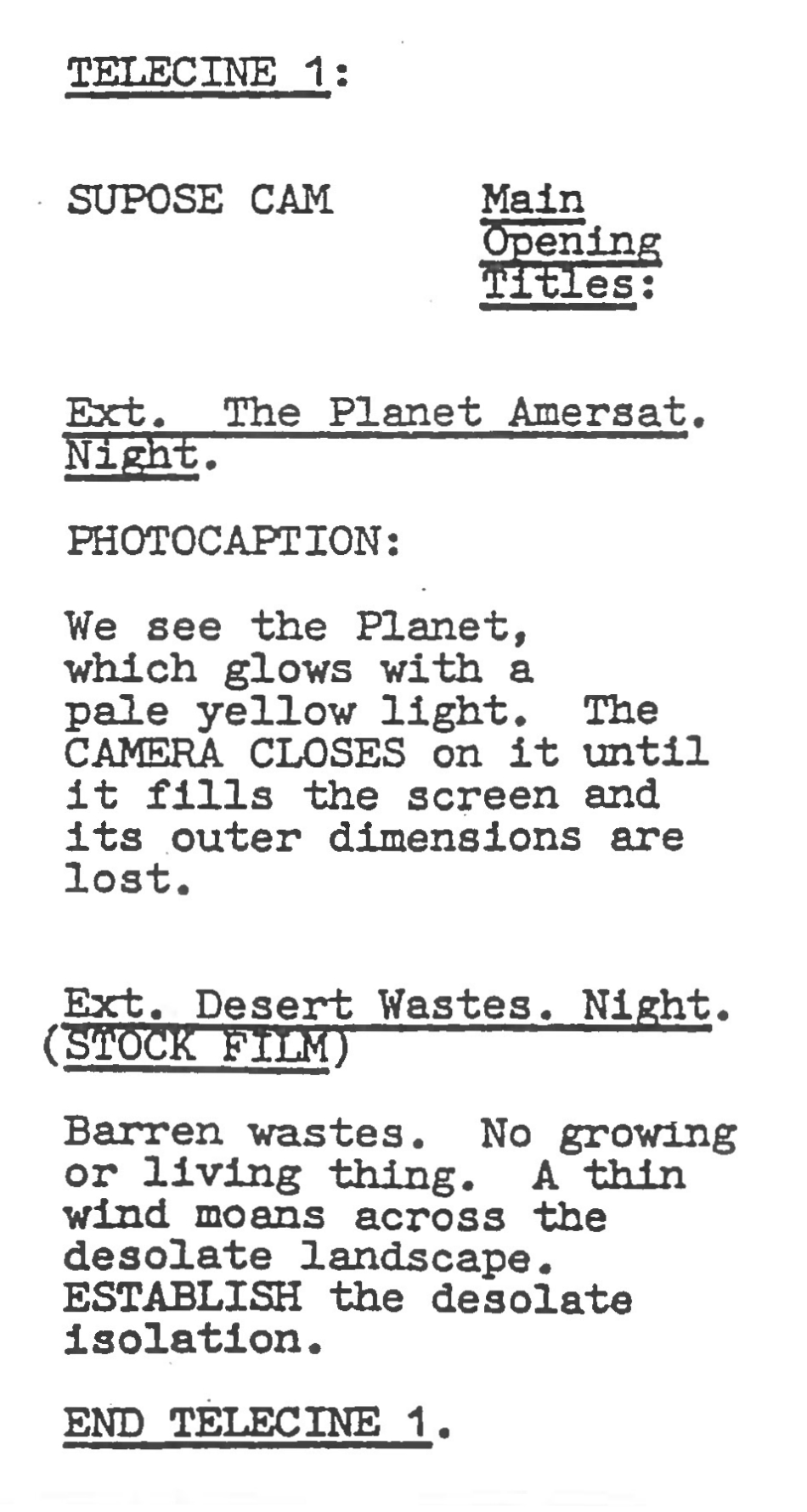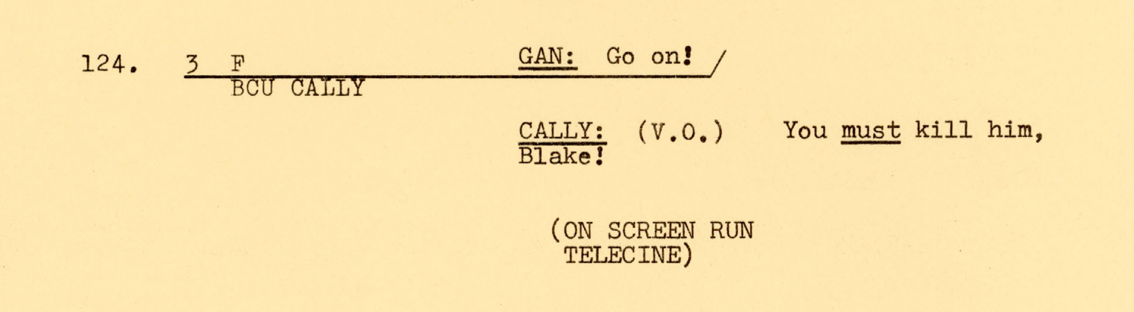 For the analysis of Blake’s 7 – ‘Duel’, I’ve decided to compare script to screen (or other production documents) and focus on how the different ingredients of television production combine. It’s interesting to see what happens when the various processes that make up a television production collide with a director such as Camfield to produce dynamic material for a series with considerable budgetary limitations. In the Screen interview, Camfield himself describes the potential of these contributions.
