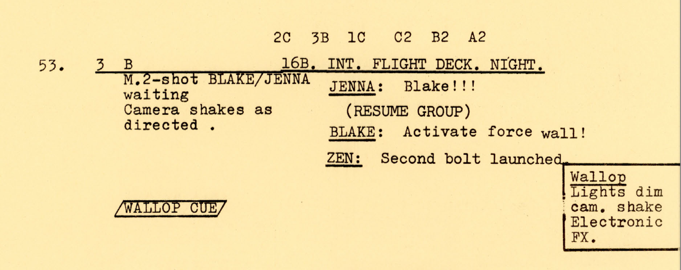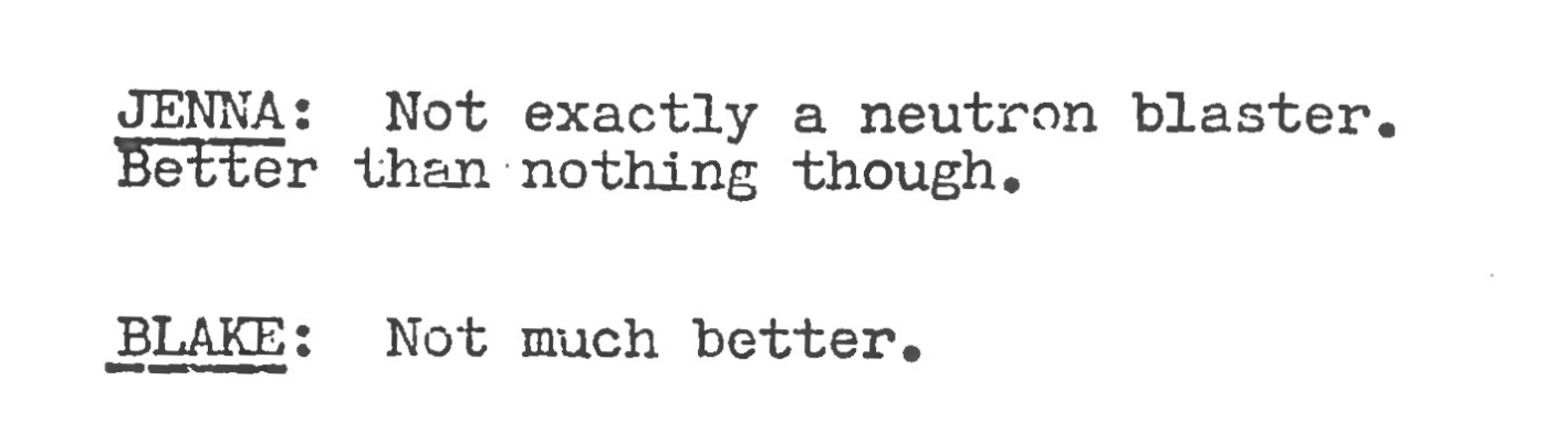The difference in portrayal is best captured in her assessment of the spears that apparently will be better than nothing. “Not much better, though“, Jenna mutters to herself. Interestingly, the rehearsal script has the lines swapped between Blake and Jenna.