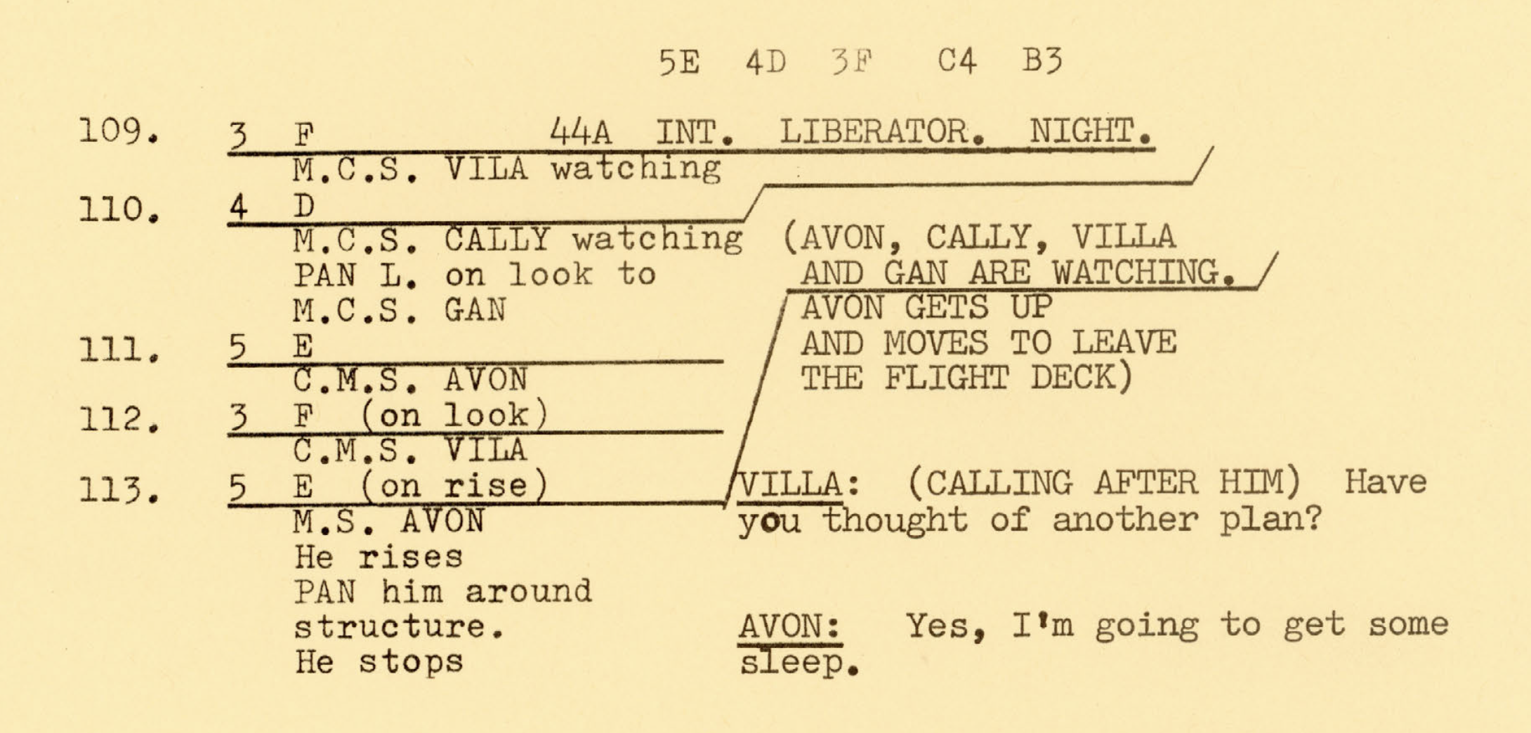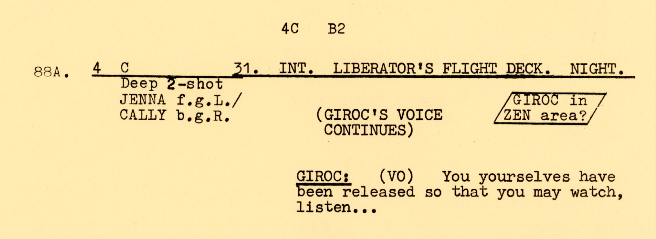 What is interesting here is the difference in the choice of camera composition and movement from the scenes on Travis’ ship. There’s a single camera shot that lasts for almost 30 seconds, starting from the moment Blake leaves his position, comes across to Jenna, onto a discussion between four characters, then focusing on a stare-off between Vila and Avon, before resting on a single shot of Avon at his flight deck position. It’s like a relay race, a shot that is blocked carefully, and therefore captures the interactions in a connected way, rather than a series of interconnecting shots. The camera movement conveys the dynamics of the characters, in contrast to the static shots on board Travis’ ship.