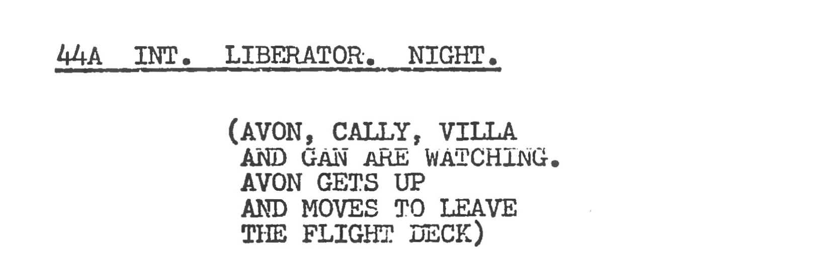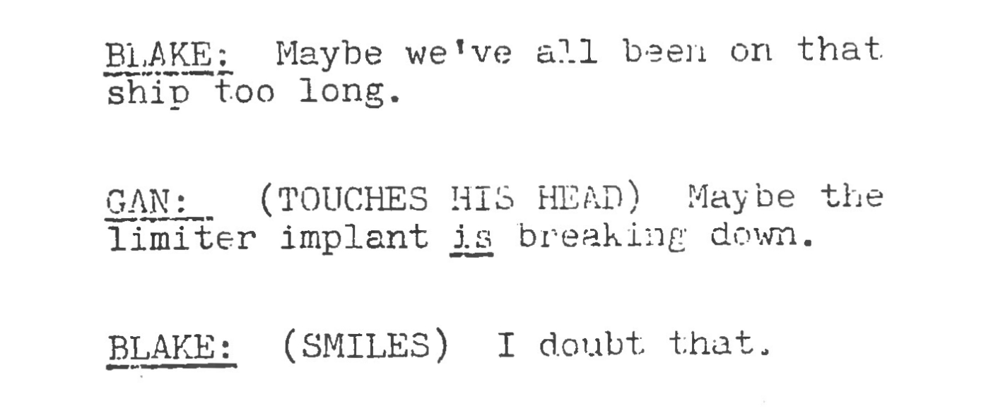 As for Avon, thoughts often turn towards his all-knowing shake of the head when Blake decides not to kill Travis, and it is a good shot. However, a more interesting moment is where the camera nonchalantly pans across the characters watching the duel, but then cuts suddenly, and almost prematurely, to Avon holding an implement. The almost rattlesnake sound effect echoes the nighttime wildlife that Jenna and Blake are navigating, but also captures Avon’s self-determination to conduct himself however he wishes. It’s a step up from the original script that simply has Avon get up and walk away from the flight deck.