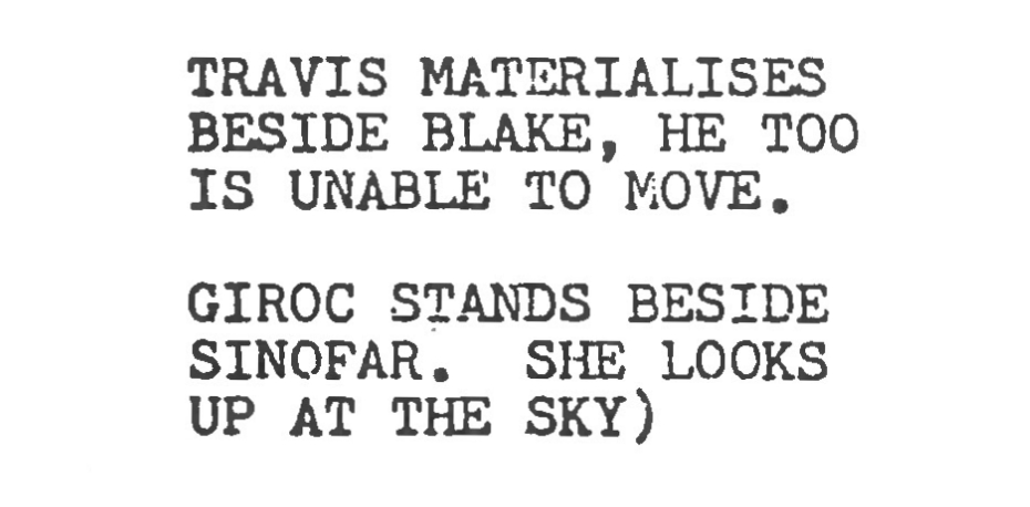 There are other examples. As already mentioned, Travis is slightly more vindictive and sharp than in any other episode, and several shots show this off. Cally is slightly softer and wiser, and Camfield’s close-ups on her as they watch the events unfolding on the screen are contemplative. This includes her stare into the middle distance during the moment where Blake decides not to kill Travis. It emphasises her mystical roots, and is a very different directorial decision from the rehearsal script.