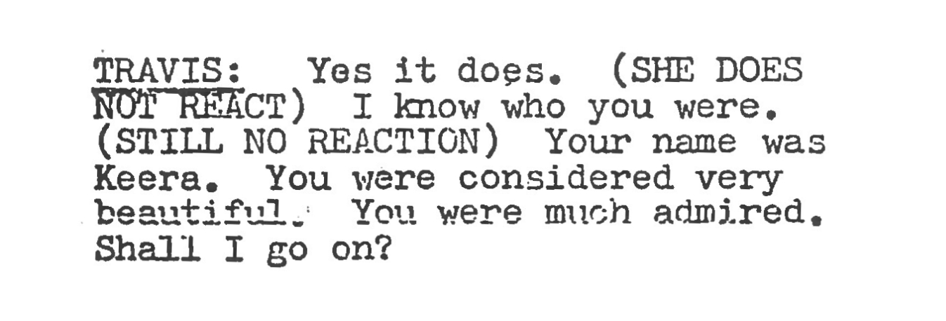 Travis’ hunt to elicit something from the Mutoid is highlighted by some subtle amendments to the script. In the rehearsal script (issued after the location filming), the Mutoid does not repeat the name she was given. However, on location, she utters the name in response to Travis, suggesting a faint trace of identity. Carol Royle briefly looks into the middle distance, reaching for a memory.
