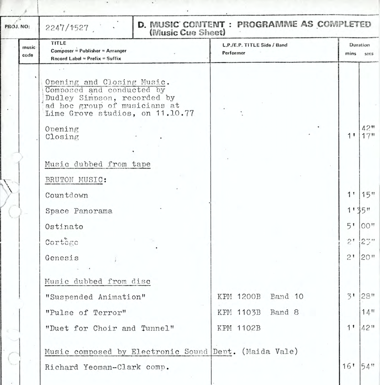Given that this video is designed to illustrate how Camfield carefully selected his music scores, rather than accurately document these alternative choices, I have exercised a degree of creative license, with a few tracks layered on top of each other, or some subtle re-ordering. There’s even some authentic crackles from the sound effects. I hope you enjoy it.