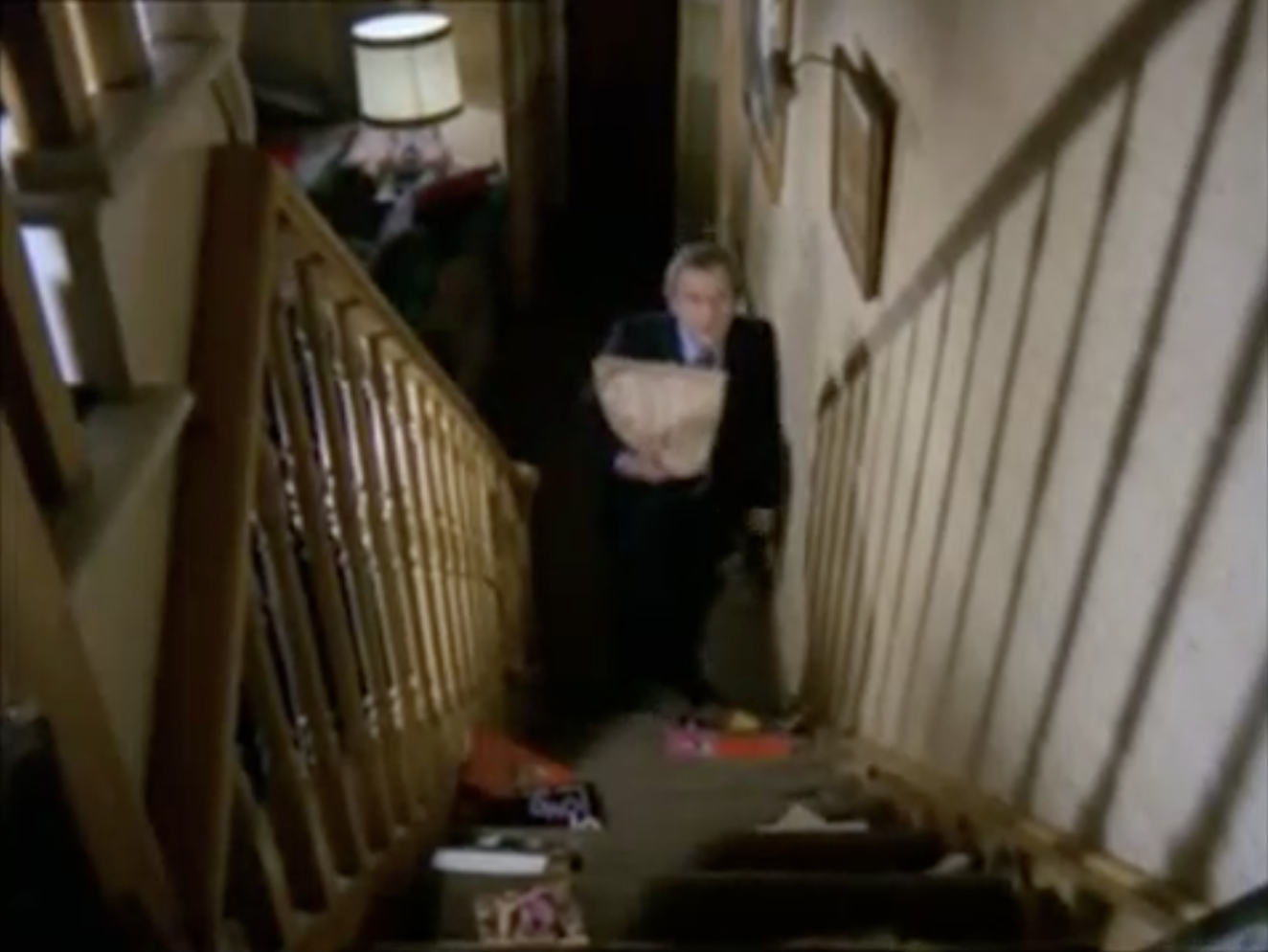 We then switch to the bedroom, where the camera is crucially positioned at a low angle at the foot of the bed. The perspective is different. We look up at Regan, who is briefly small and helpless. However, the camera angle provides a clue as to where the body might be. Then, the camera follows Regan as he moves around the bed, and we are suddenly looking down from his eye level. Again, these lines bring us right into the scene and guide us on how we should be reading the architecture of the space and the intent of the narrative.